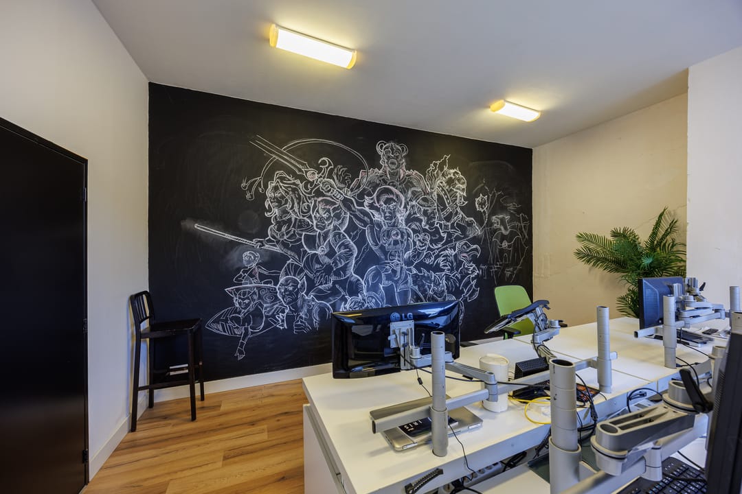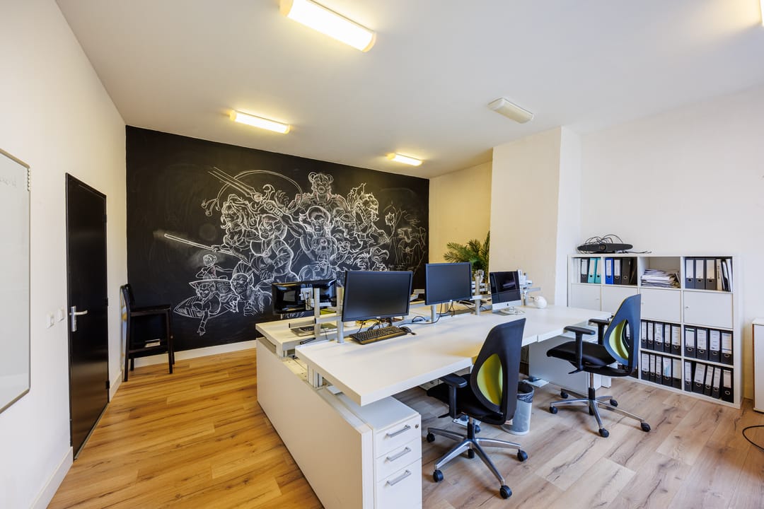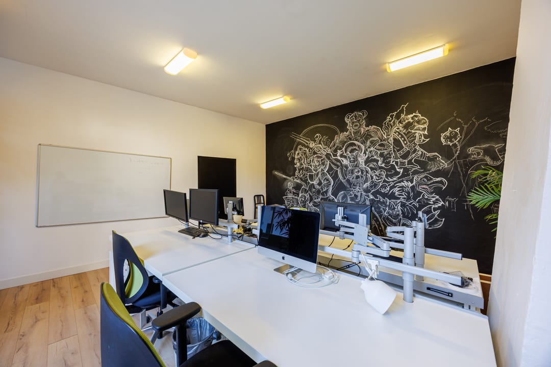 De unit is voorzien van meerdere moderne werkplekken, compleet met meubilair, bureaustoelen, monitorarmen en opbergmogelijkheden.