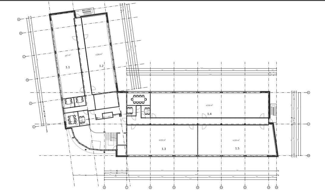 Eerste verdieping – ca. 830 m²: Geschikt voor meerdere huurders. Beschikt over 7 vergaderruimtes en 5 ruimtes van verschillende groottes variërend van circa 97 m² tot 150 m².