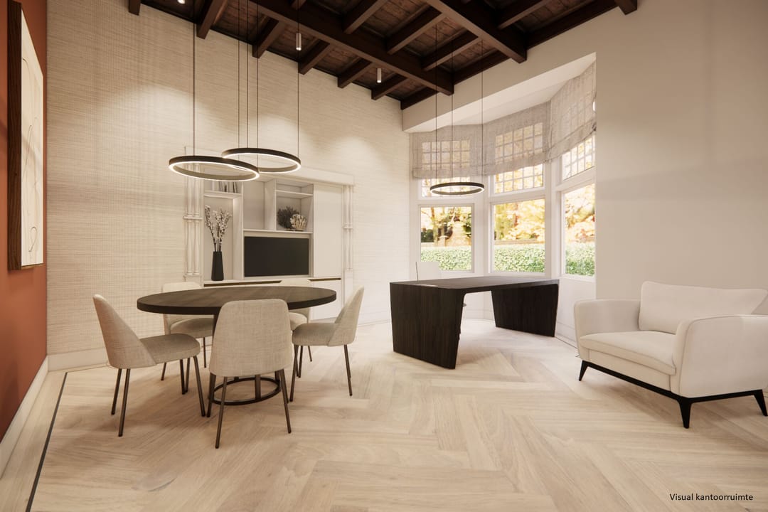 Bij binnenkomst via de klassieke bordestrap en de vestibule op de begane grond, wordt direct de toon gezet voor uw relaties. De imposante centrale hal met zijn schitterende authentieke bordestrap vormt het kloppend hart van het pand. Hier bevinden zich vier royale, lichte werkvertrekken waar de grote erkers zorgen voor een overvloed aan daglicht en een inspirerende blik op de omgeving. Deze ruimtes lenen zich bij uitstek voor een stijlvolle receptie, directiekamers of formele vergaderzalen. In de aangebouwde vleugel aan de achterzijde bevindt zich bovendien een riante, multifunctionele ruimte die perfect functioneert als modern ‘open office’ of creatieve studio. Praktische faciliteiten zoals drie toiletgroepen en een pantry met aangrenzende eetkamer maken deze verdieping volledig zelfvoorzienend, terwijl het aangrenzende terras uitnodigt voor een informele brainstorm in de buitenlucht.