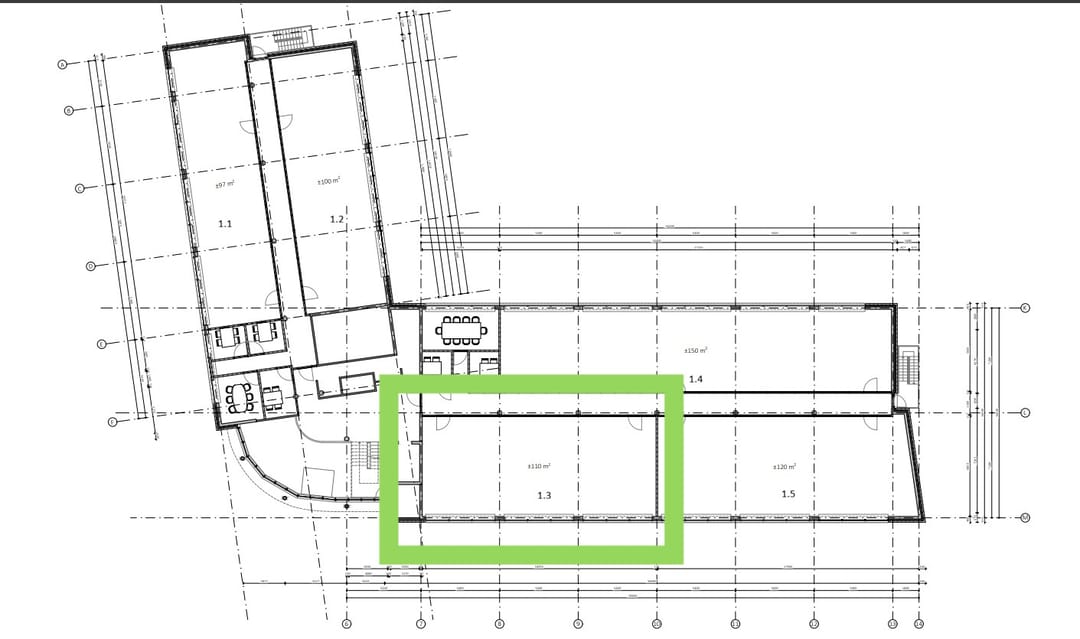 Ruimte 1.3 (110 m²) bevindt zich op de eerste verdieping – ca. 830 m². Flexibel in te delen voor middelgrote huurders.