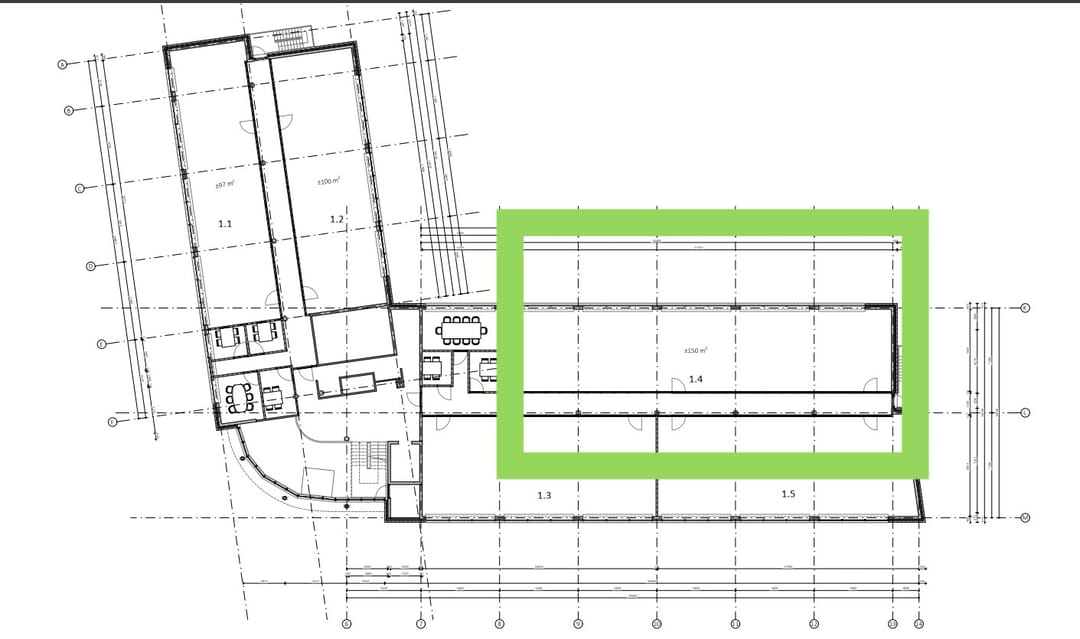 Ruimte 1.4 (150 m²) bevindt zich op de eerste verdieping – ca. 830 m². Flexibel in te delen voor middelgrote huurders.