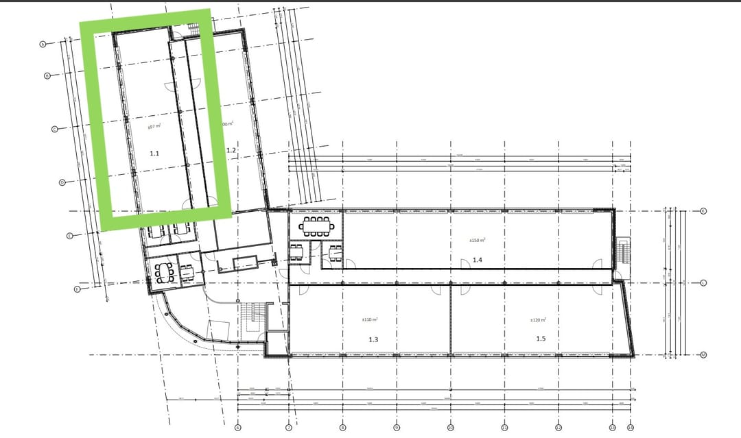 Ruimte 1.1 (97 m²) bevindt zich op de eerste verdieping – ca. 830 m². Flexibel in te delen voor middelgrote huurders.