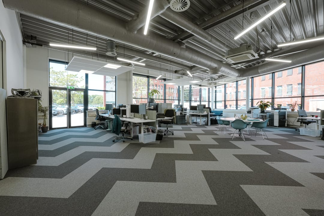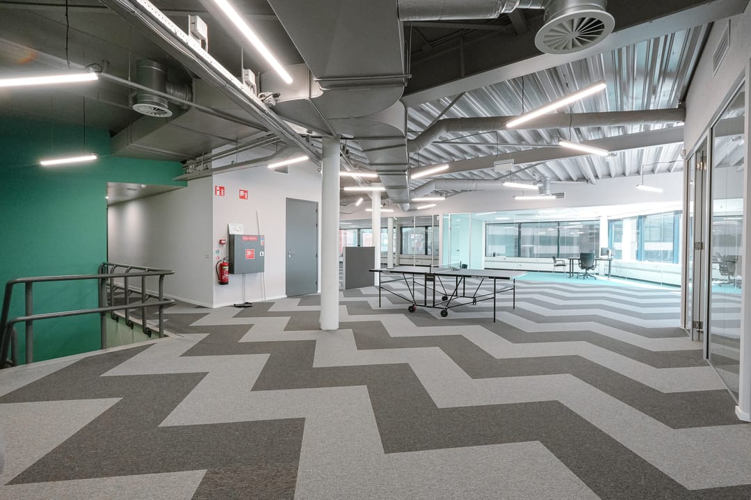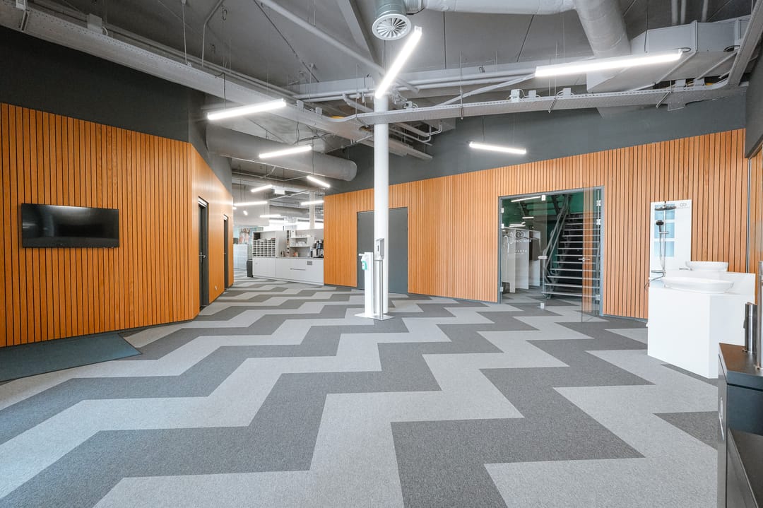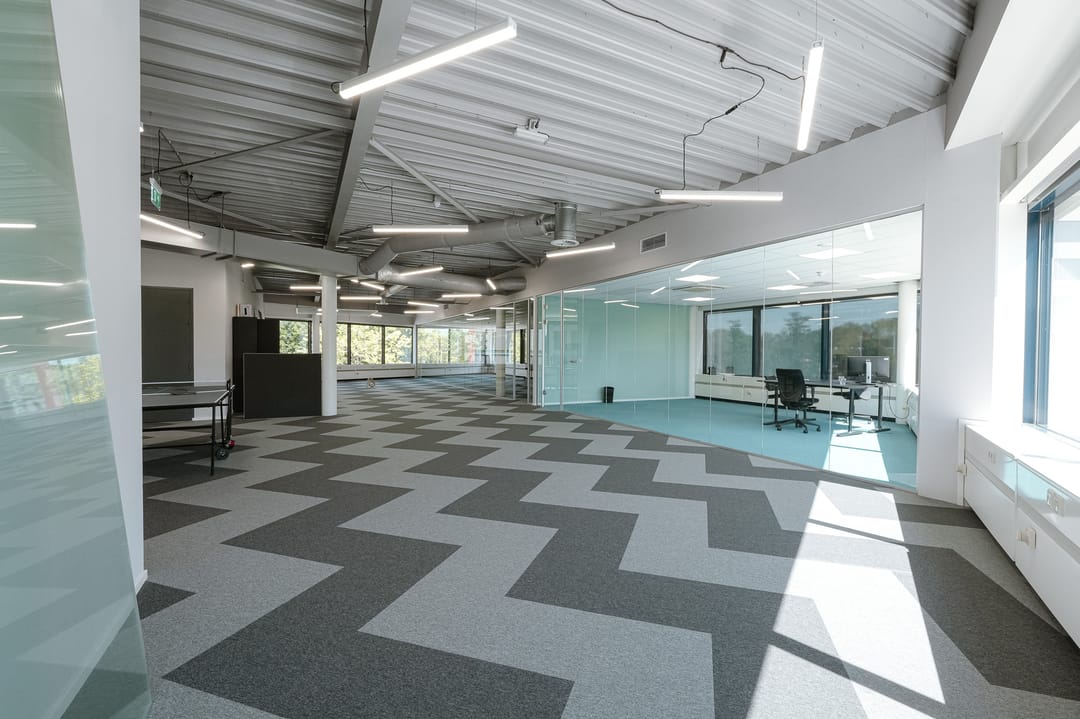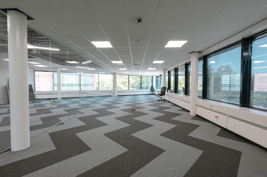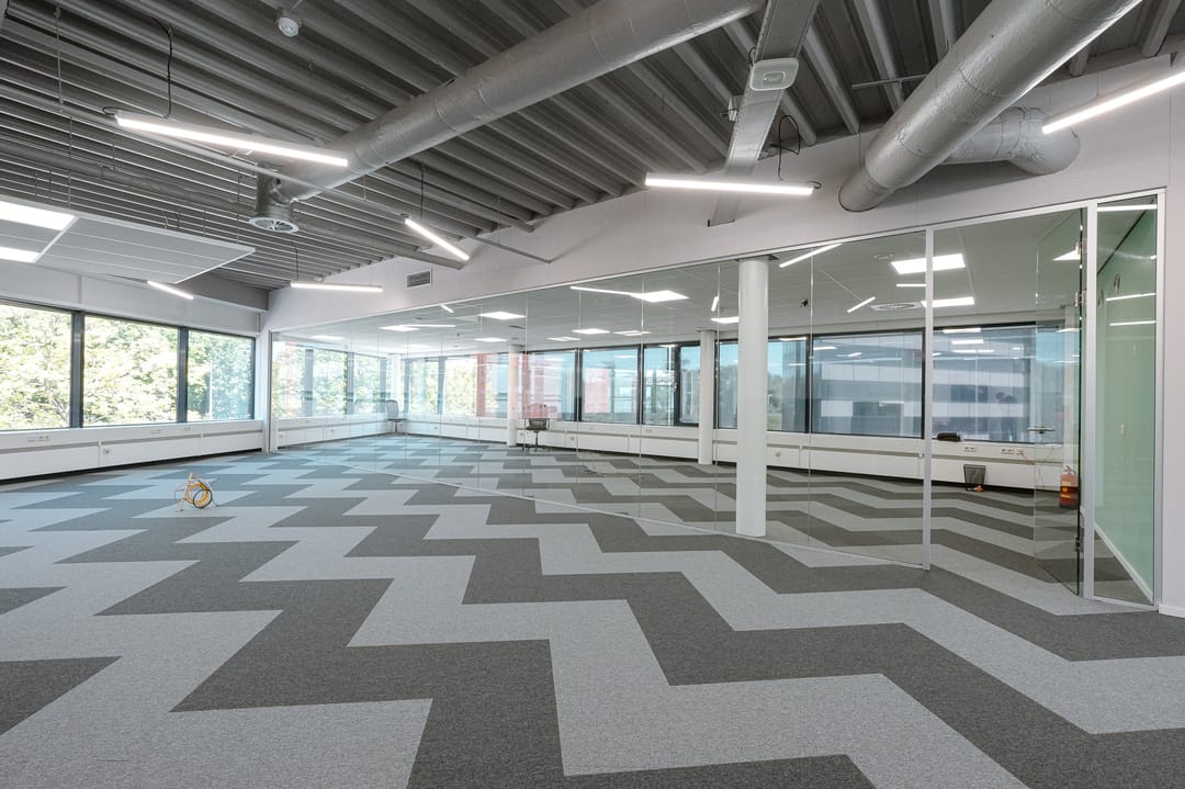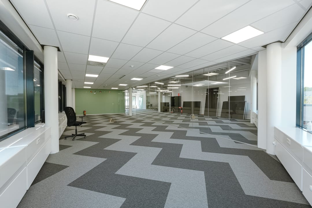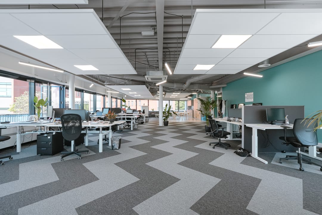 - Deels een systeemplafond voorzien van LED-inbouwverlichtingsarmaturen en deels een industrieel plafond