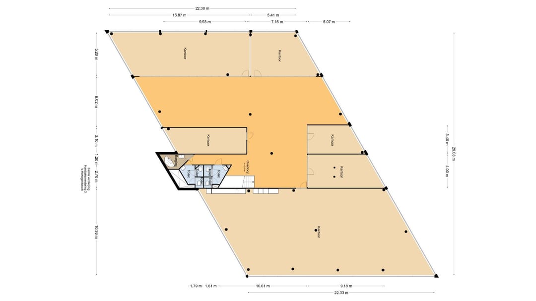 Het object beschikt over circa 1.880 m² kantoorruimte waarvan circa 1.240 m² gelegen op de begane grond en circa 640 m² gelegen op de eerste verdieping.
