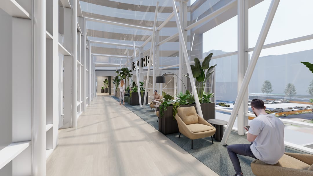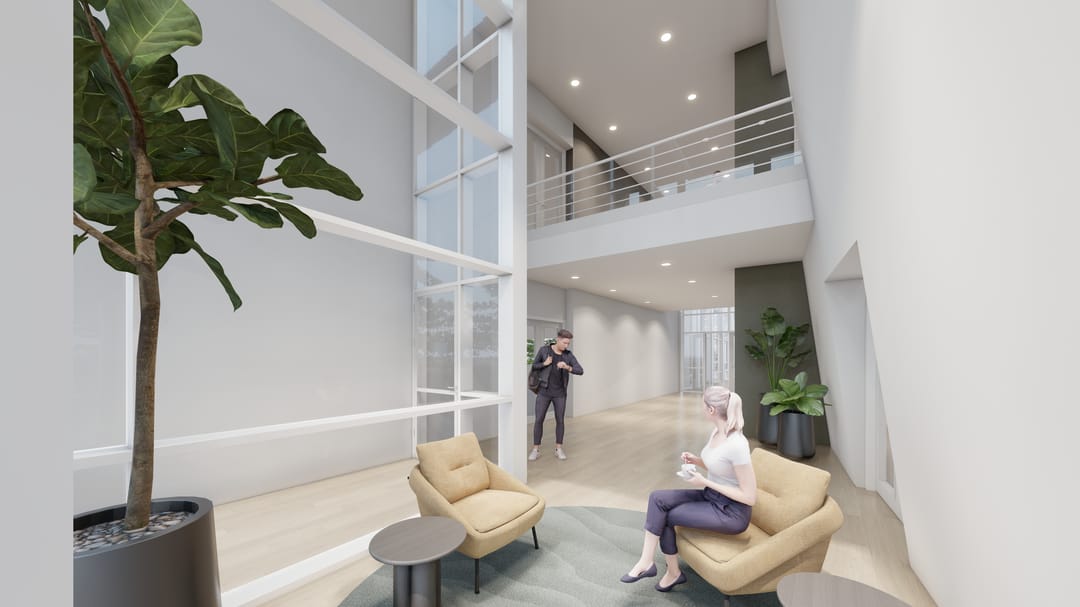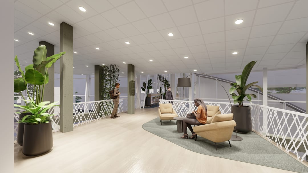 In 2025 worden de algemene ruimten van het gebouw voorzien van een nieuwe look & feel. De renders hiervan zijn toegevoegd aan de foto’s.
