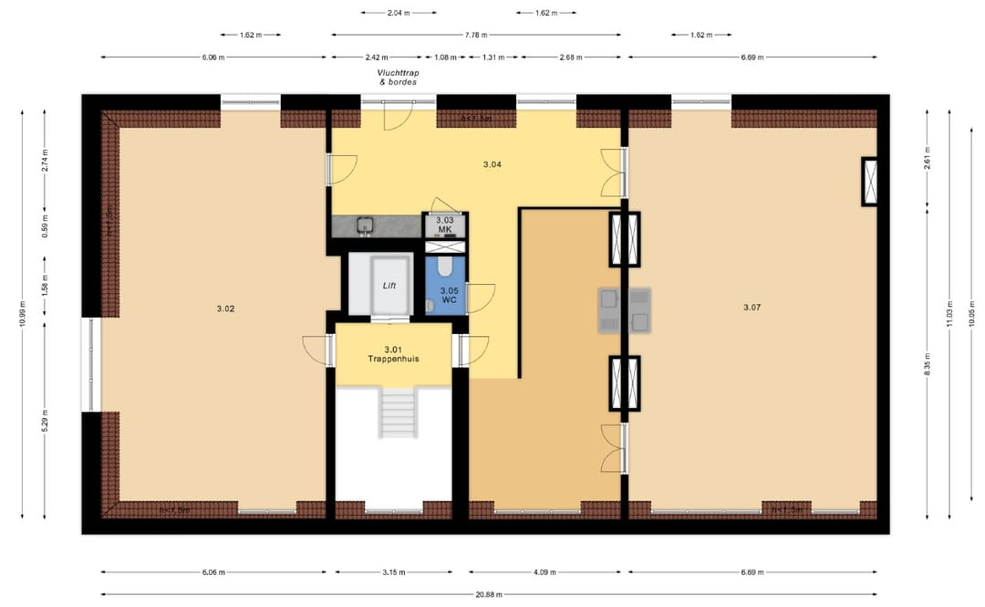 - Inbouwarmaturen, te openen ramen, kabelgoten, toilet, pantry, verwarming en kamerindeling