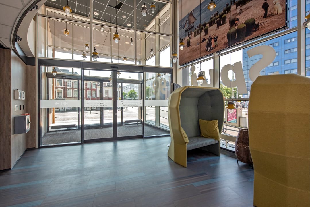 Het kantoorgebouw heeft een royale centrale entree gelegen op de hoek van het Spui en de Ammunitiehaven met een aparte rolstoelvriendelijke buiten-opgang en dubbele liften.