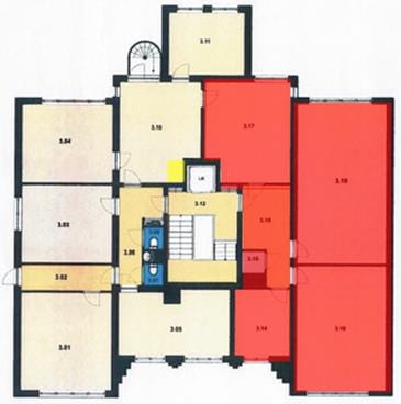 120 m² gelegen op een deel van de derde verdieping. Het betreft de kantoorkamers aan de linkerzijde op de bijgevoegde tekening.