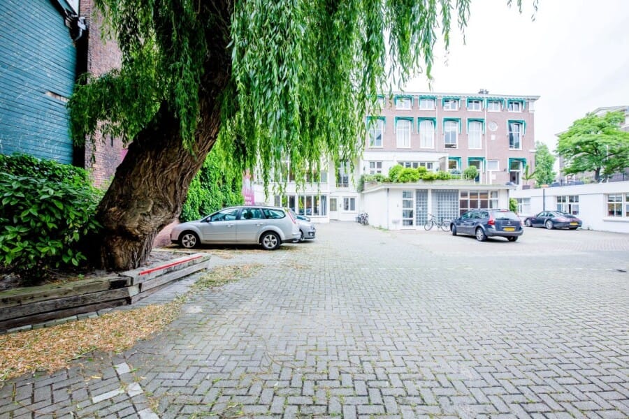 Op het achter terrein van het gebouw (toegankelijk via de Amaliastraat) is, indien gewenst, een parkeerplaats voor verhuur beschikbaar en is er ruimte voor het stallen van fietsen.