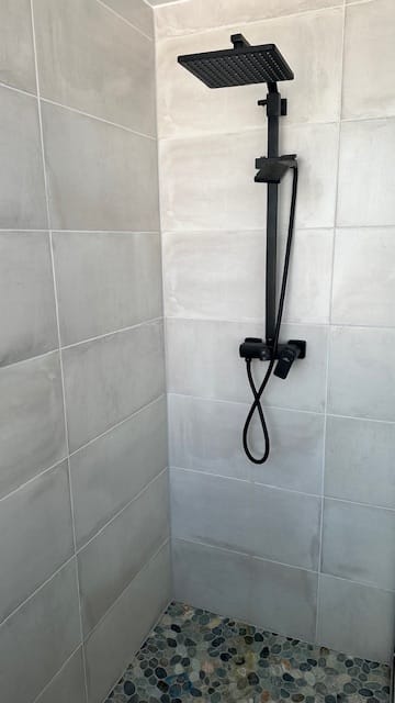 Een badkamer met inloopdouche, wastafel en vrijdragend toilet. Een bergkast en kasten.