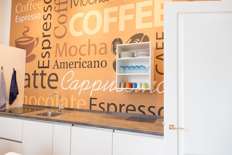 - keuken met ijskast, vaatwasser, fornuis en koffie en thee
