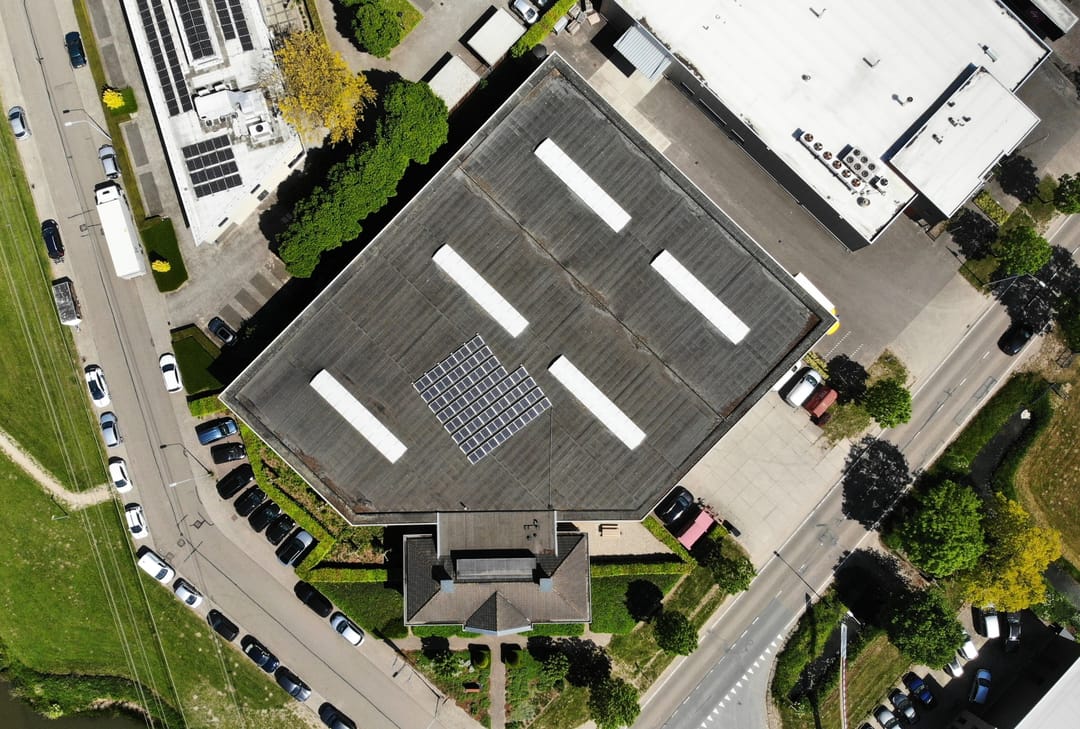 - 44 Zonnepanelen op het platte dak van het magazijn