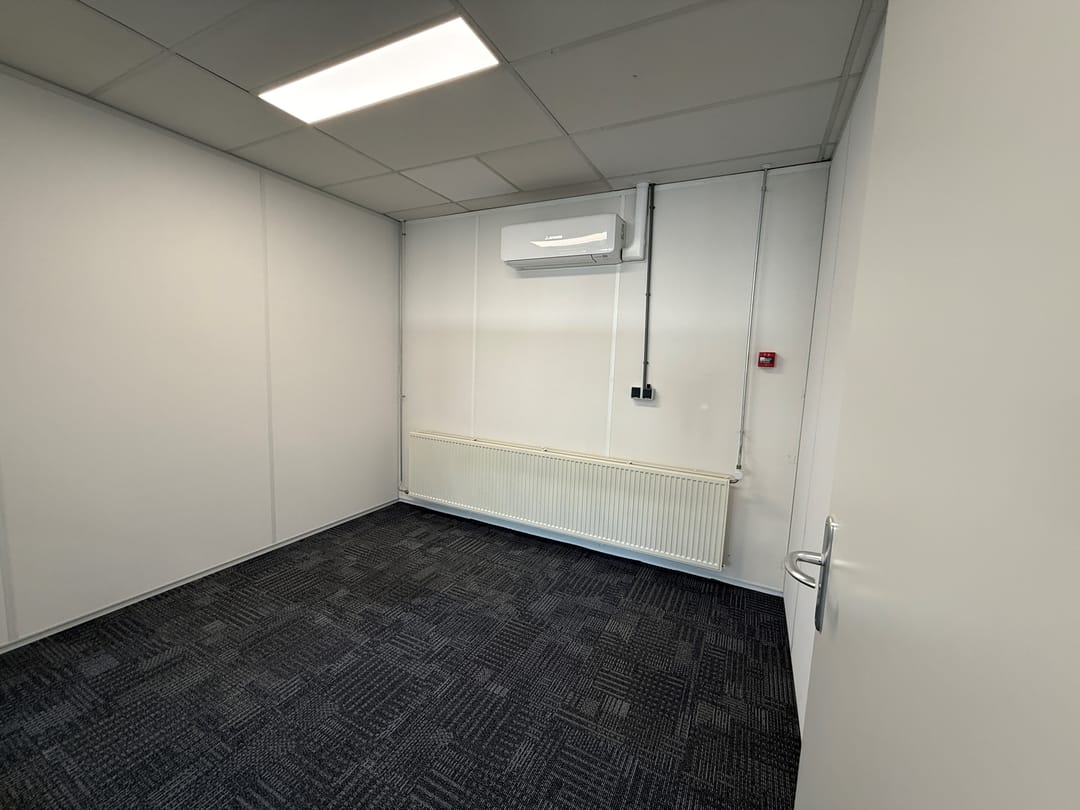 bestaande uit een entree met toilet groep, berging/patchruimte. Royale ontvangstruimte met keukenblok en vanwaaruit toegang tot de 8 kantoren.