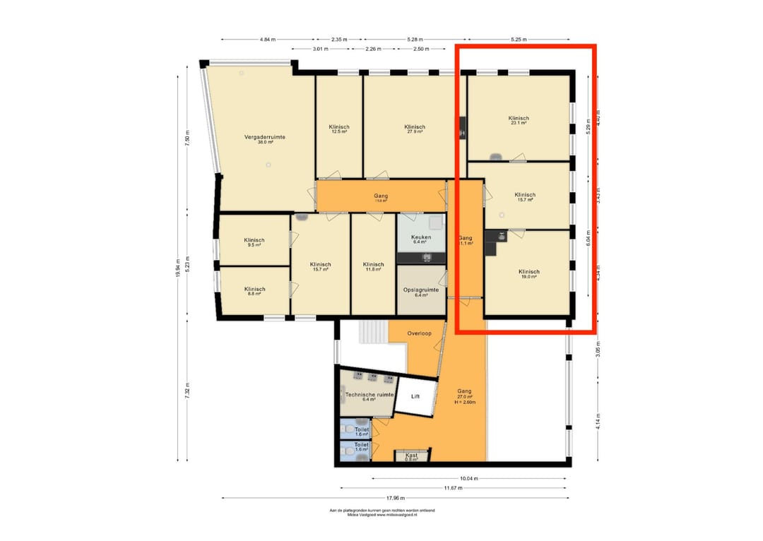 De verstrekte informatie is met zorg samengesteld, maar hieraan kunnen geen rechten worden ontleend. Deze publicatie geldt uitsluitend als uitnodiging tot het voeren van overleg en niet als een aanbod. Alle transacties en afspraken zijn uitdrukkelijk onder voorbehoud van goedkeuring door opdrachtgever, die zich het recht voorbehoudt de procedure te wijzigen of in te trekken zonder opgaaf van redenen. Publicatie of overname van deze informatie is niet toegestaan. Opgegeven maten en oppervlakten zijn indicatief.