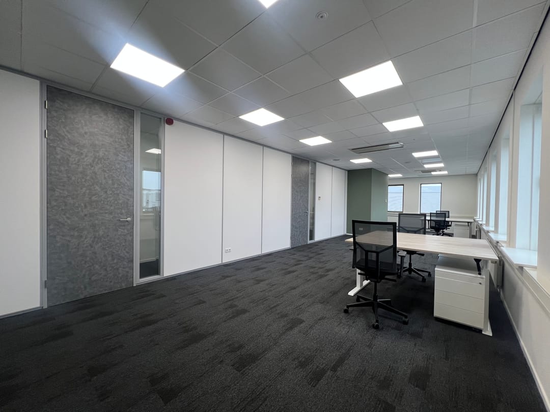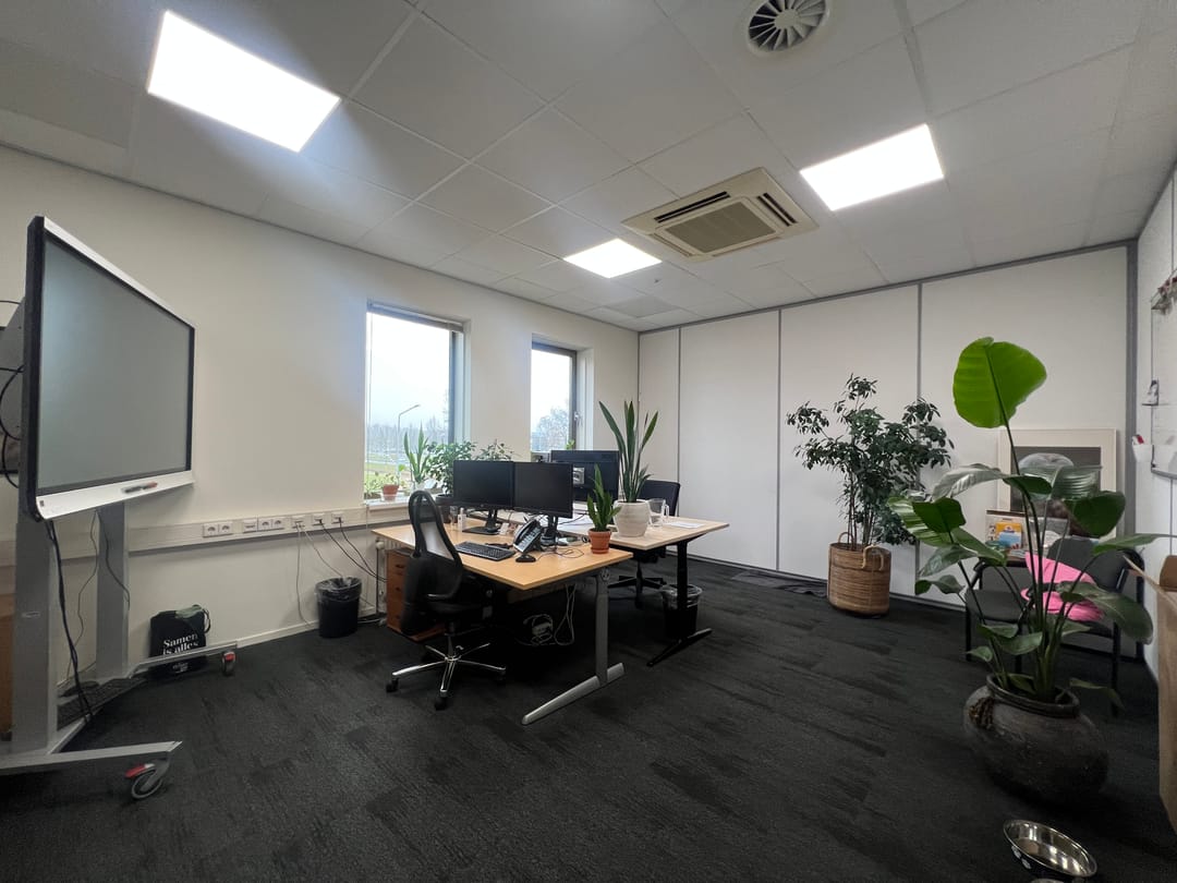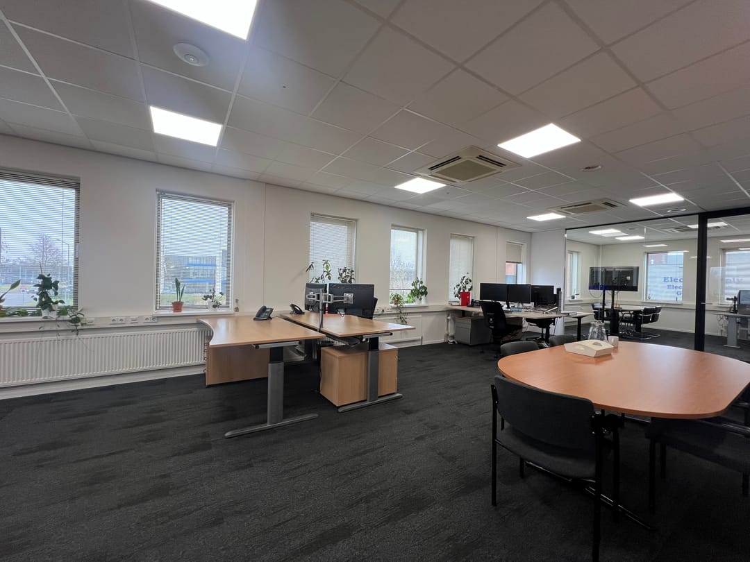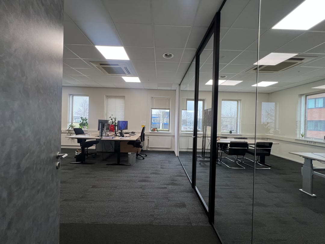 Het kantoorgedeelte aan de linkerzijde betreft grotendeels een open kantoor en is deels ingedeeld in compartimenten, de L-vormige kantoorruimte aan de rechterzijde beschikt over één afsluitbaar kantoorcompartiment. De ruimten beschikken over een keurig opleverniveau met o.a. tapijt, koeling door middel van airco-units, verwarming door middel van radiatoren en rondom ruime daglichttoetreding door de raampartijen. In de hal bevinden zich de gemeenschappelijke pantry en toiletten.