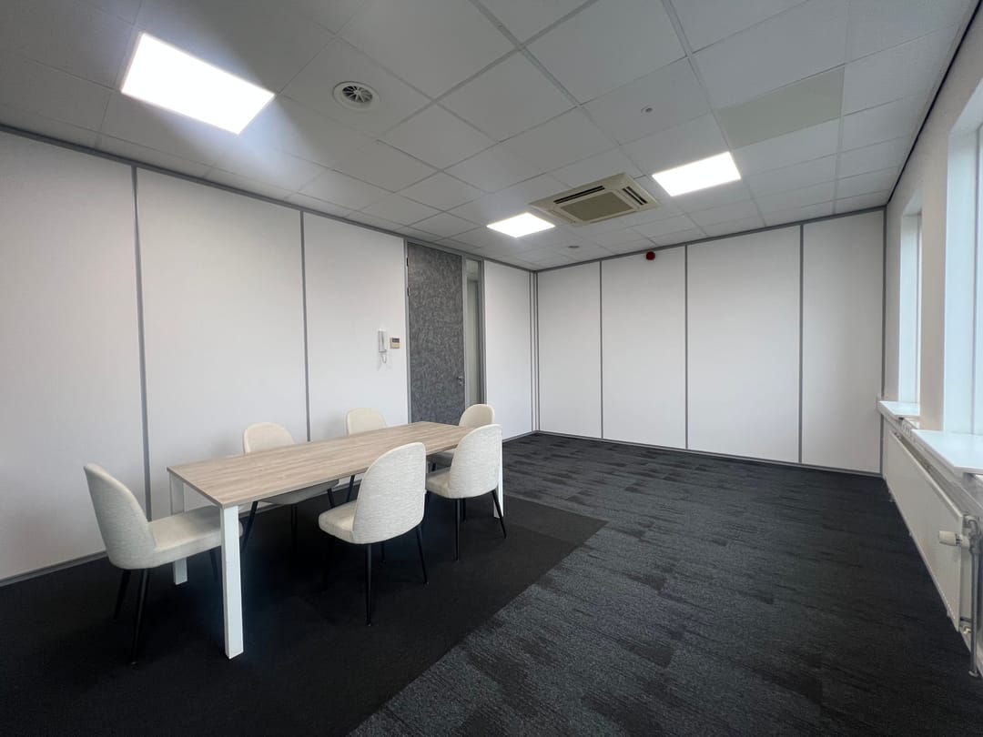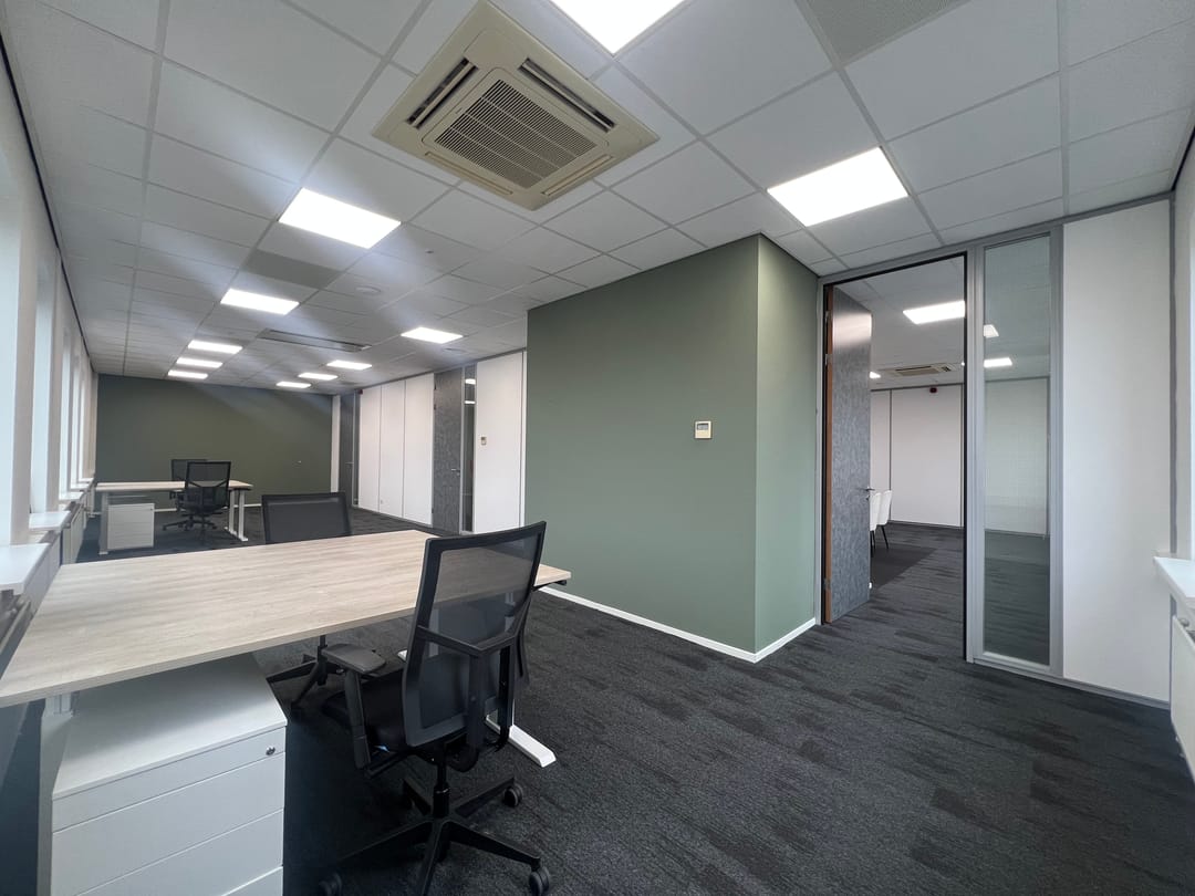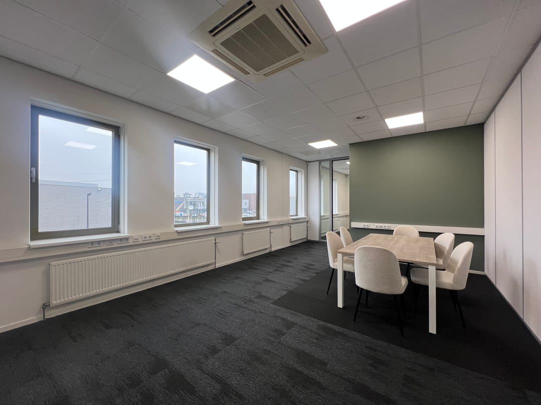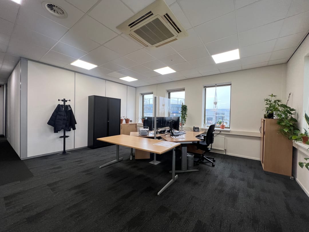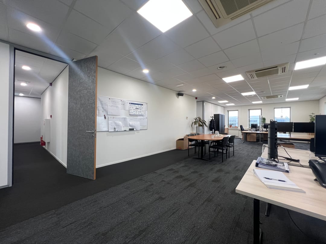 Het kantoorgedeelte aan de linkerzijde betreft grotendeels een open kantoor en is deels ingedeeld in compartimenten, de L-vormige kantoorruimte aan de rechterzijde beschikt over één afsluitbaar kantoorcompartiment. De ruimten beschikken over een keurig opleverniveau met o.a. tapijt, koeling door middel van airco-units, verwarming door middel van radiatoren en rondom ruime daglichttoetreding door de raampartijen. In de hal bevinden zich de gemeenschappelijke pantry en toiletten.