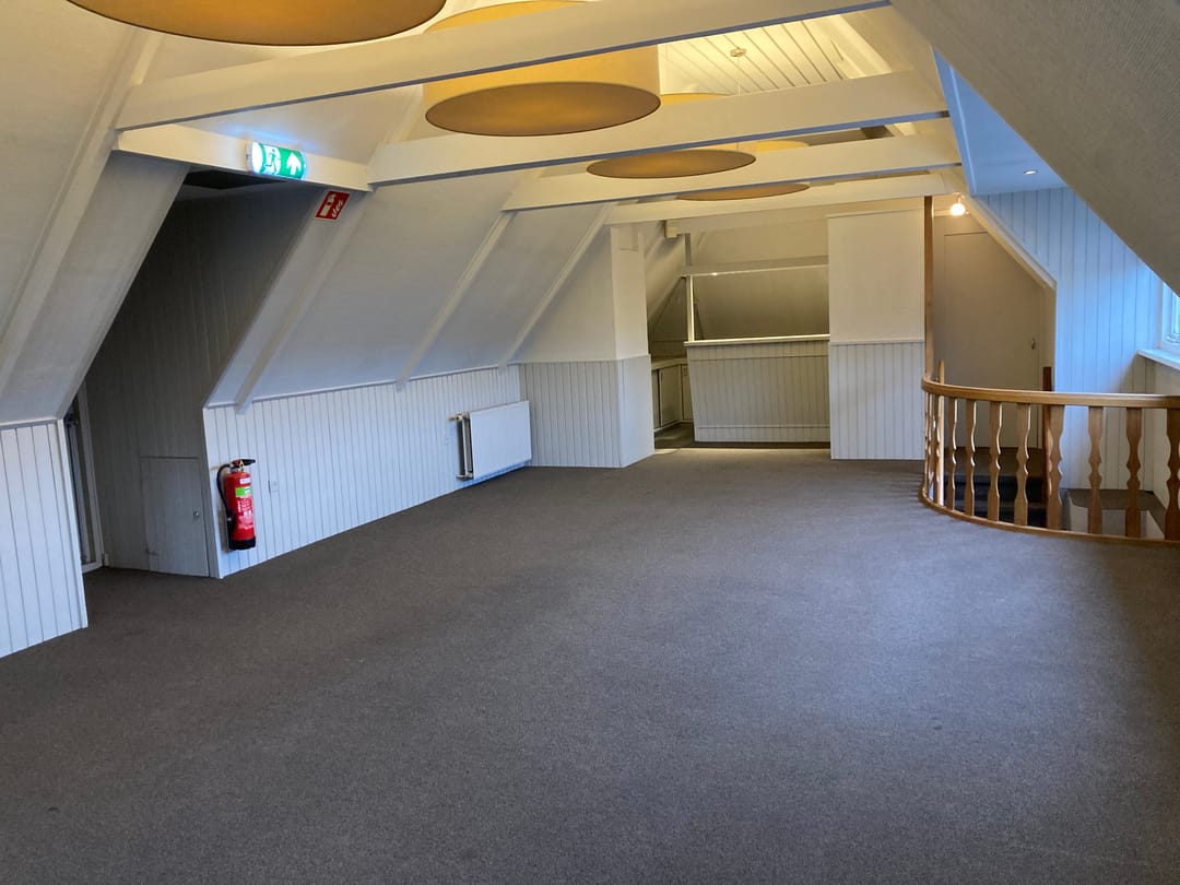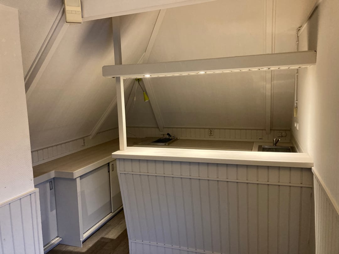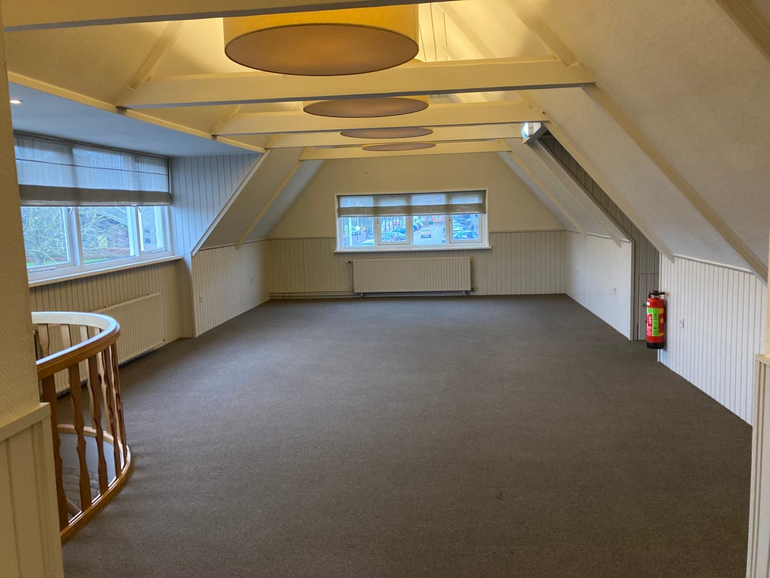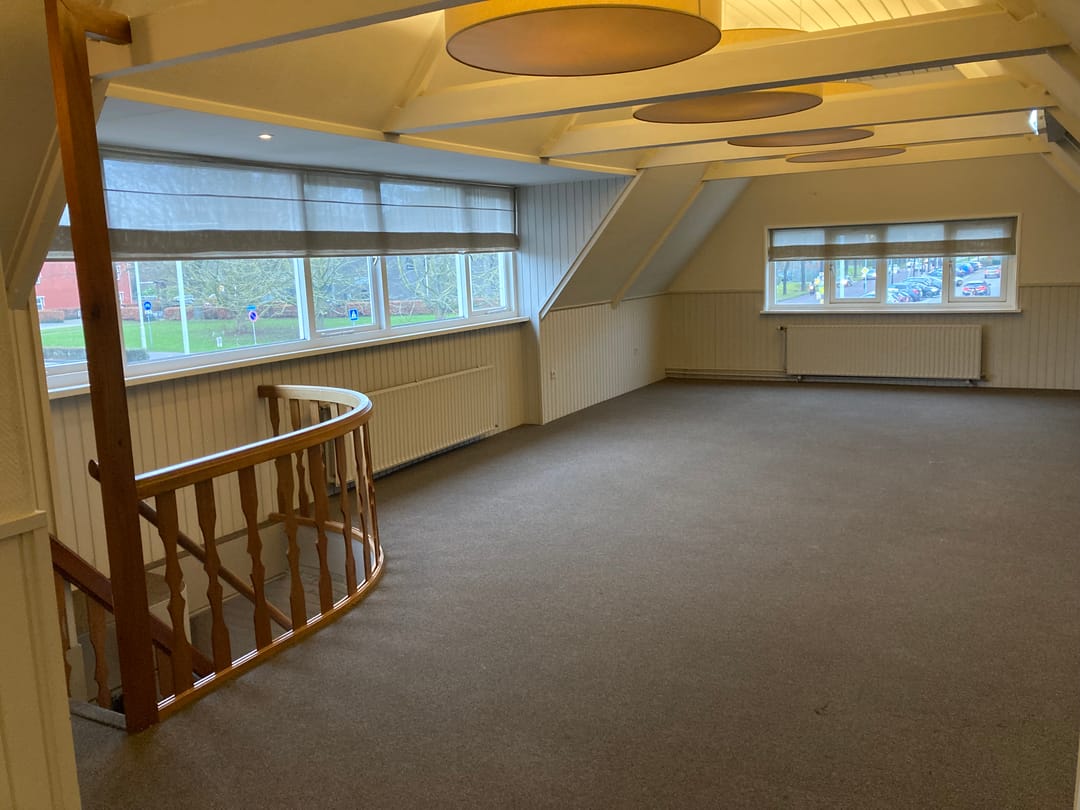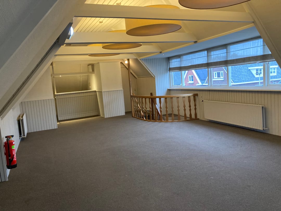 Indeling: zij-entree, hal, trap naar 1e verdieping waar één open kantoor-/praktijkruimte is met voldoende daglichttoetreding (o.a. een grote dakkapel), inloopkast en een open keuken. De toiletten zijn op de begane grond (gezamenlijk gebruik).