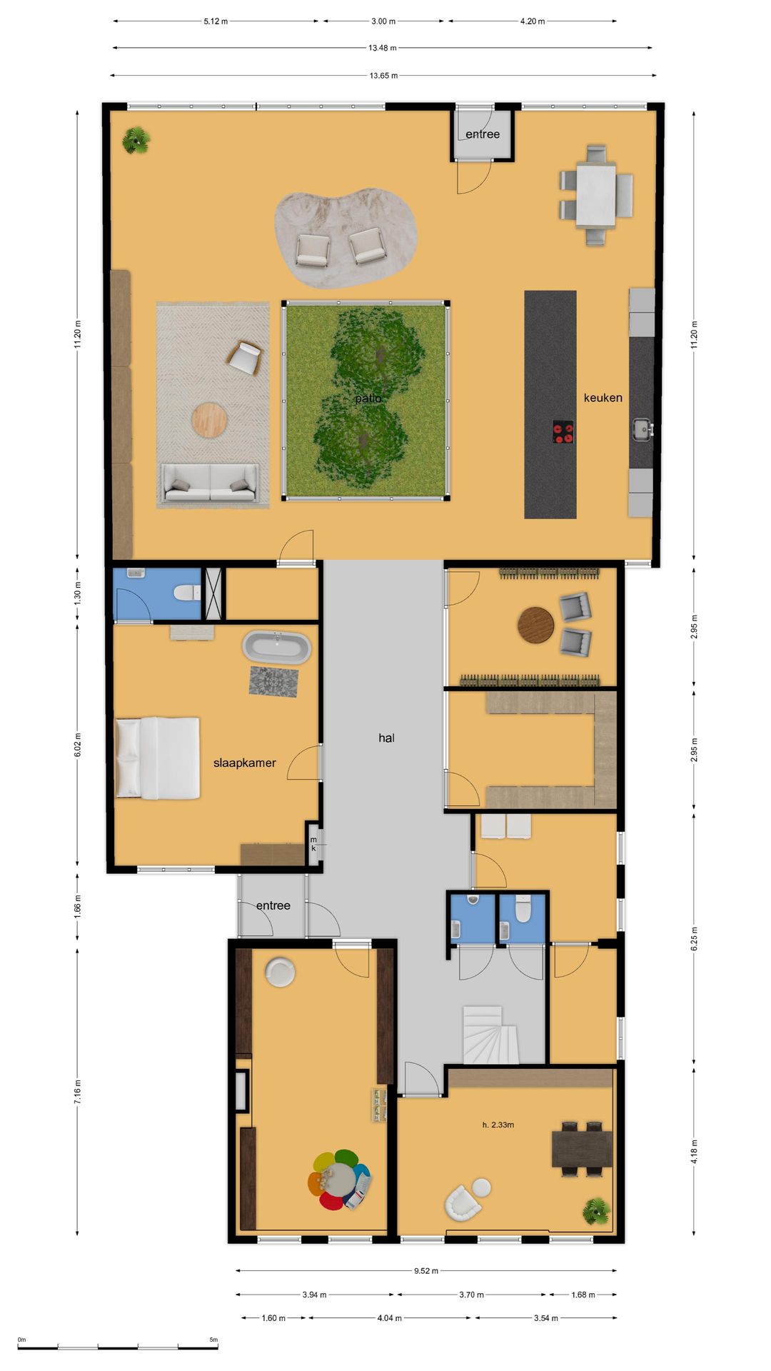 Via de entree aan de zijkant komt u binnen in de royale hal, die toegang geeft tot meerdere multifunctionele ruimten. Aan de voorzijde bevinden zich een fijne verblijfsruimtes, ideaal in te richten als ontvangstruimte of werkvleugel. Aan de achterzijde bevindt zich de patio, omsloten door lichte werk of verblijfsruimten. Verder zijn er een mogelijkheid voor een pantry, toiletten, een technische ruimte en diverse bergingen aanwezig.