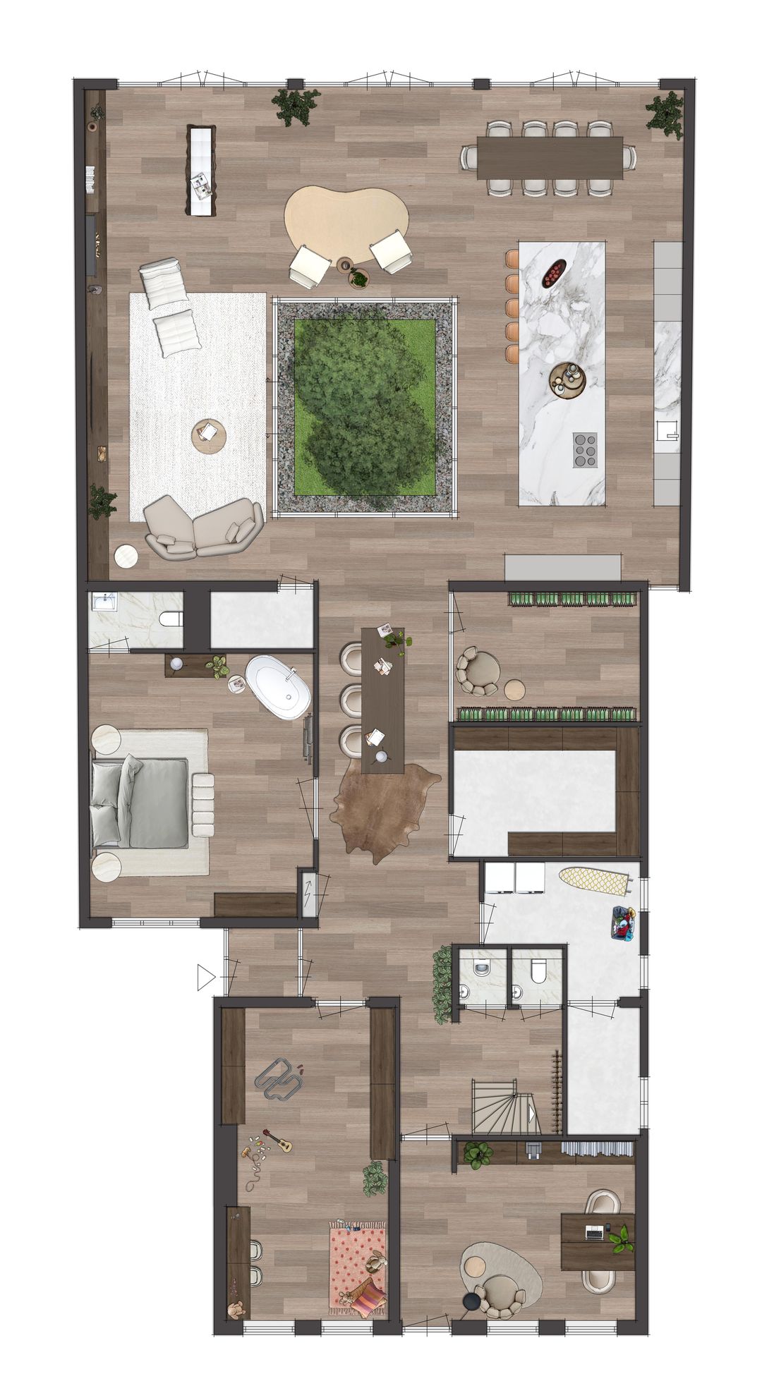 Het oorspronkelijke woonhuis vormt het voorste deel van het object, met aan de achterzijde een royale uitbouw die nu dienst doet als kantoorvleugel. De totale oppervlakte bedraagt circa 416 m², verdeeld over drie verdiepingen. Dankzij de royale maatvoering zijn meerdere indelingsvarianten denkbaar, waaronder een riante living met leefkeuken, meerdere slaapkamers, badkamer(s) en een afgescheiden werkvleugel. Aan de voorzijde blijven de huidige representatieve kantoorruimten behouden, ideaal voor ondernemers die wonen en werken willen combineren. Een impressie van deze mogelijkheden is opgenomen tussen de plattegronden.