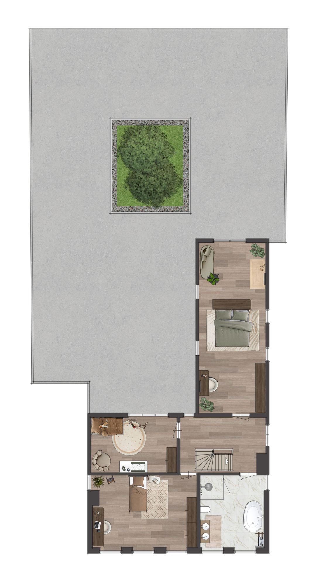 • Het oppervlakte van de tweede verdieping is niet meegenomen in de woonoppervlakte (circa 62 m²) vanwege het ontbreken van een vaste trap. Deze is eenvoudig te realiseren.