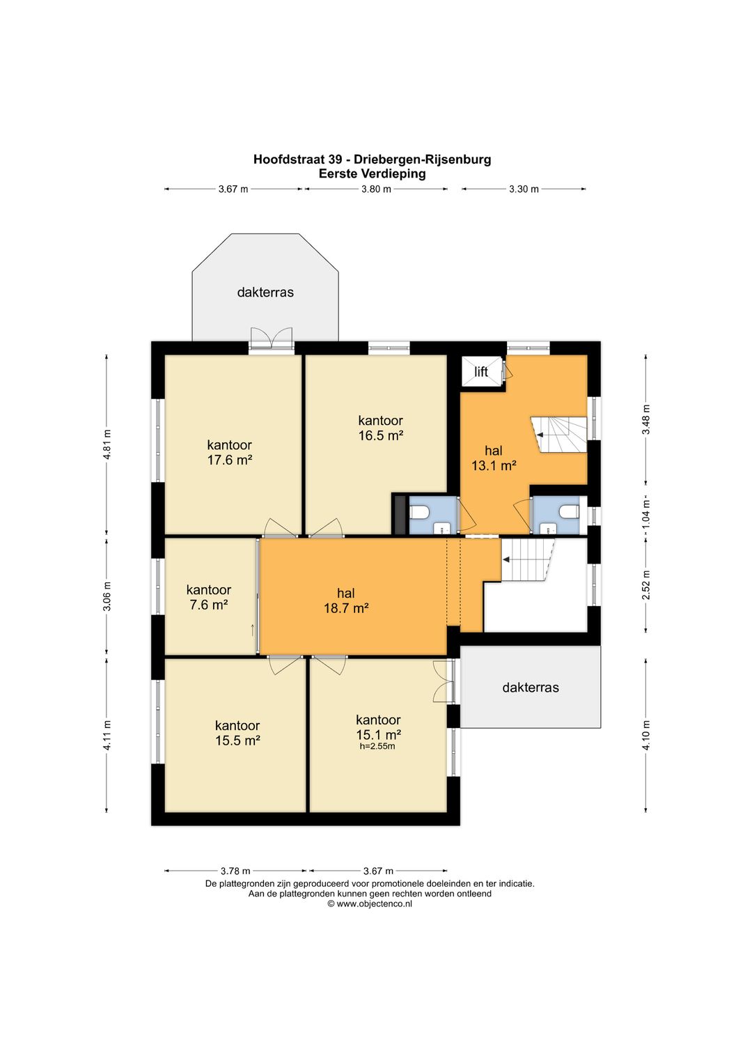 De totale verhuurbare vloeroppervlakte bedraagt circa 110 m² kantoor- en overige ruimten gelegen op de eerste- en tweede verdieping.