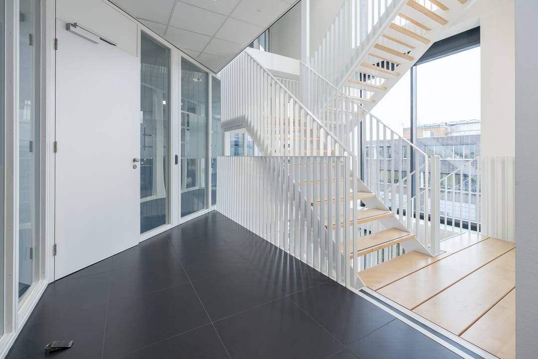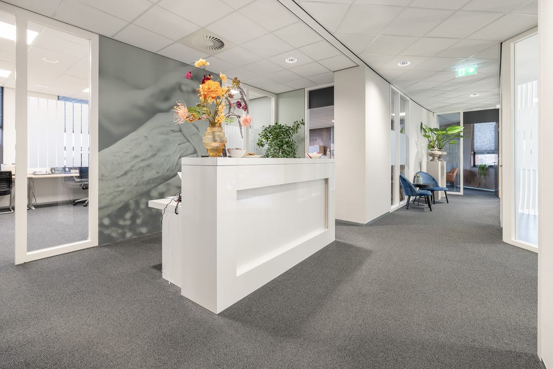 Via de hoofdentrée (met tochtsluis) komt u in de centrale hal met balie en zithoek. De trap en de lift geven toegang tot alle verdiepingen. De eerste en tweede verdieping hebben een vergelijkbare opzet met een centrale kern in het midden van de verdieping. Rondom deze kern liggen de kantoren, spreekkamers en vergaderruimtes. In de kern zijn de toiletgroepen en pantry's gesitueerd.