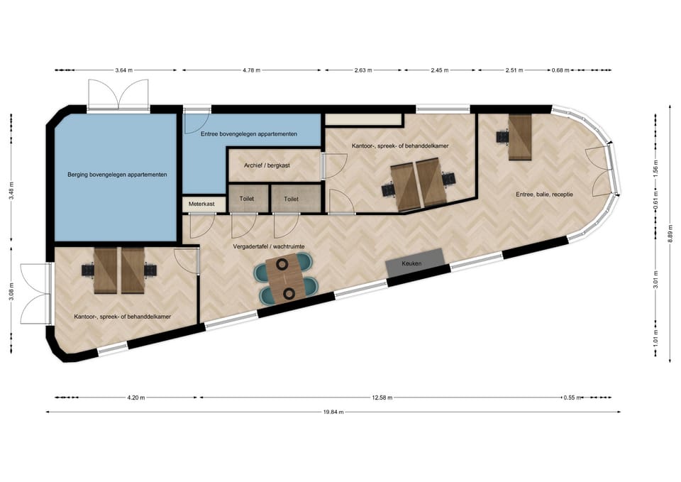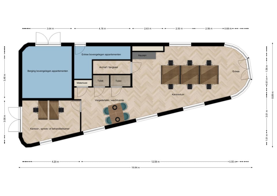 Eventuele scheidingswanden, kamers, deuren en glaswanden worden in overleg met de huurder en in samenspraak met onze architect ontwerpen en voor rekening van verhuurder aangebracht.