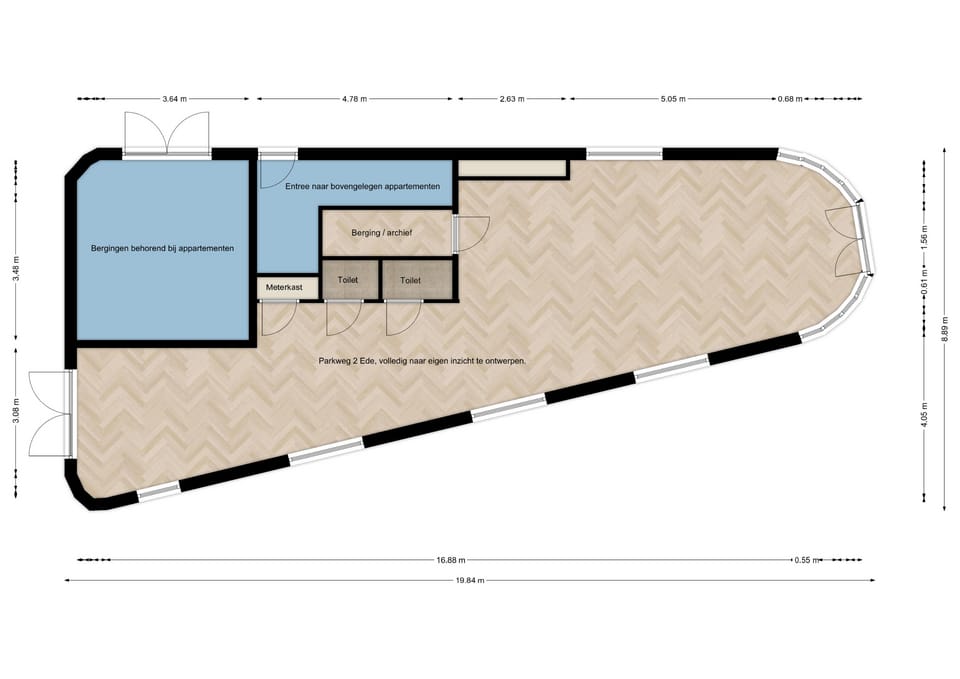 Met een zeer brede bestemming is Parkweg 2 geschikt voor detailhandel, kantoor, winkel en ook maatschappelijke doeleinden.