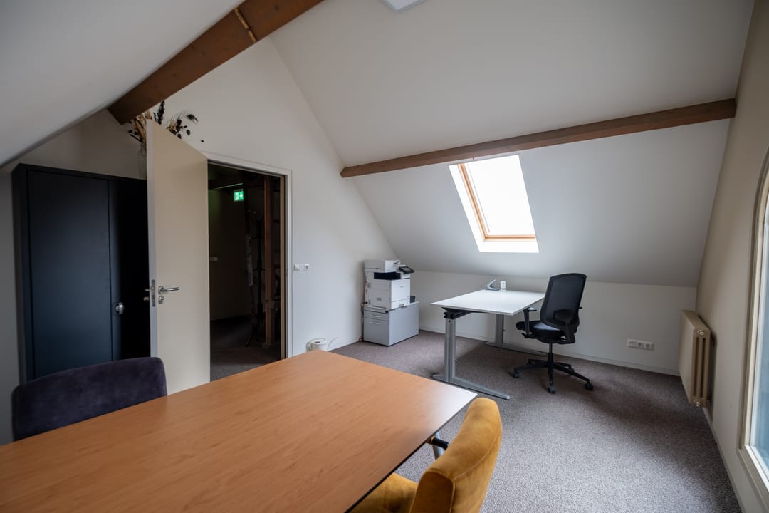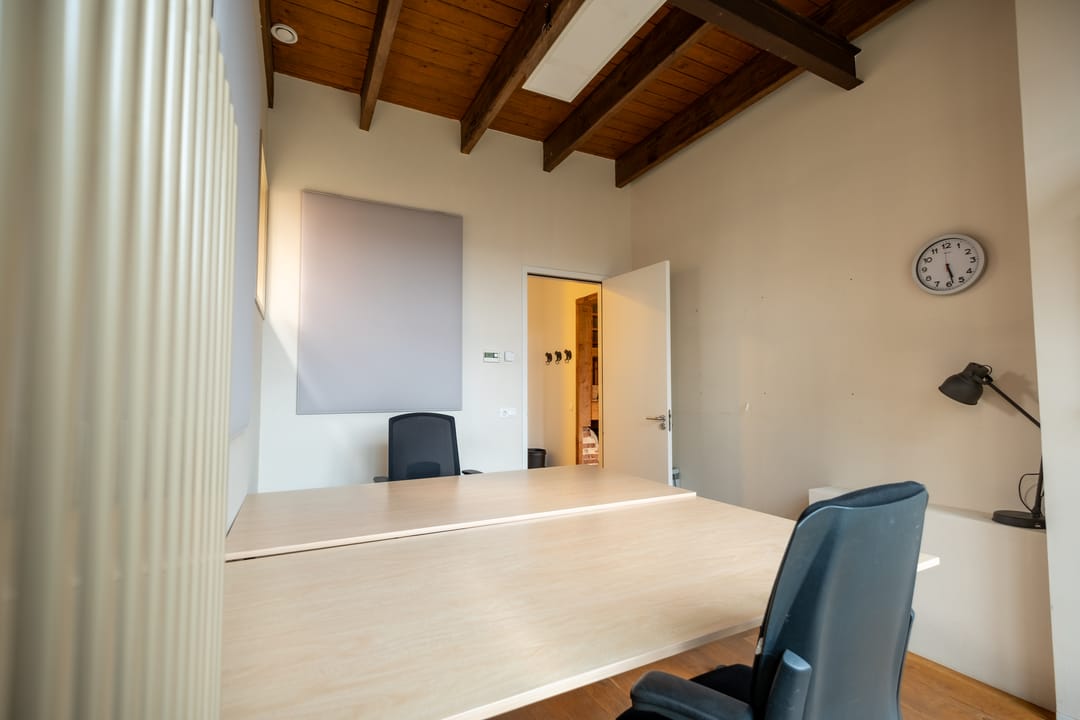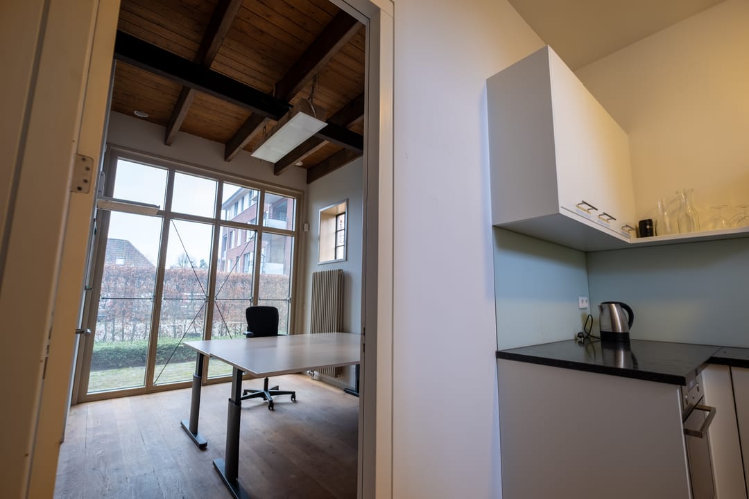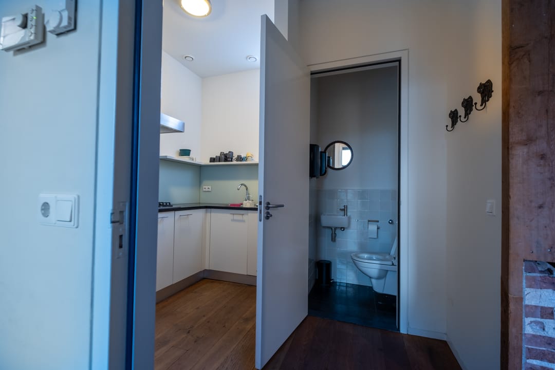 De grote open ruimte van circa 30 m² is uitstekend geschikt als bijvoorbeeld praktijkruimte of kantoor. Dankzij de grote ramen is er veel lichtinval en de aanwezige materialen en structuur geven de ruimte een karaktervolle uitstraling. Tegenover de kantoorruimte bevindt zich de keuken/pantry, uitgevoerd in een lichte kleurstelling en voorzien van onder andere een oven, gasfornuis, afzuigkap, vaatwasser en veel kastruimte.