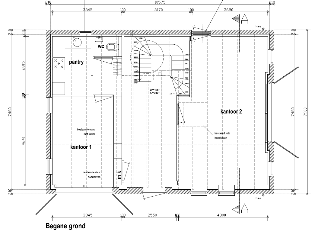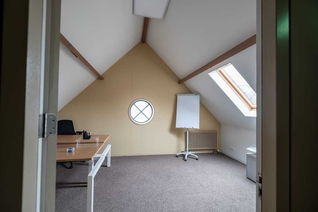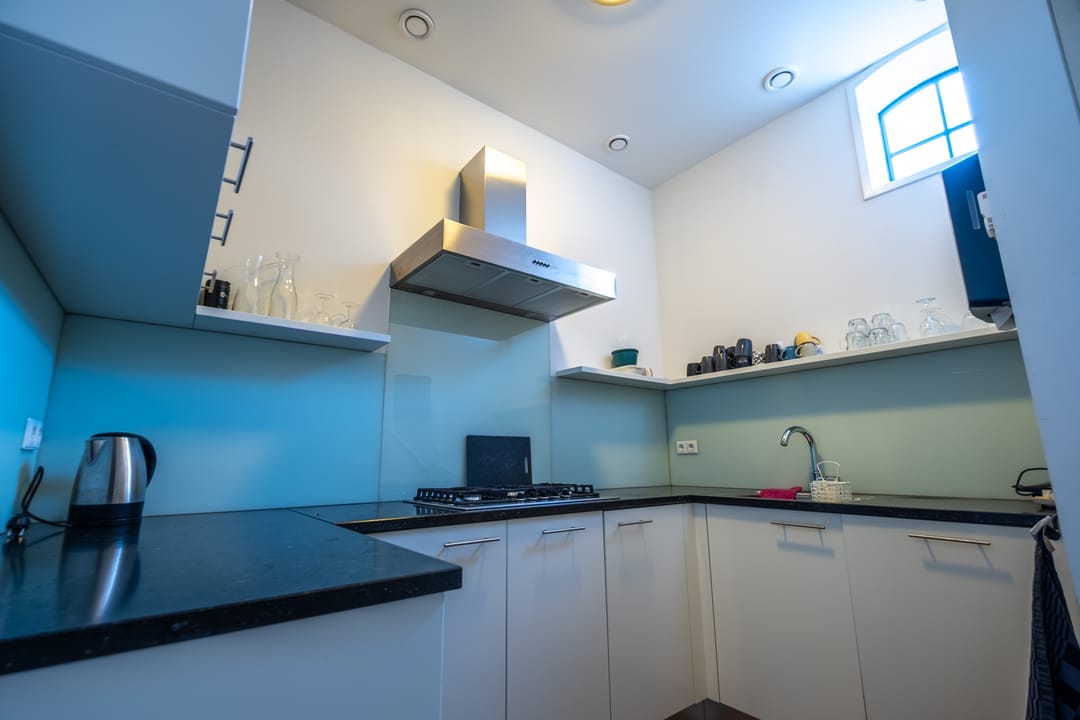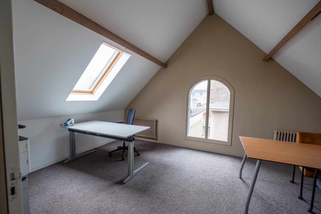 De grote open ruimte van circa 30 m² is uitstekend geschikt als bijvoorbeeld praktijkruimte of kantoor. Dankzij de grote ramen is er veel lichtinval en de aanwezige materialen en structuur geven de ruimte een karaktervolle uitstraling. Tegenover de kantoorruimte bevindt zich de keuken/pantry, uitgevoerd in een lichte kleurstelling en voorzien van onder andere een oven, gasfornuis, afzuigkap, vaatwasser en veel kastruimte.