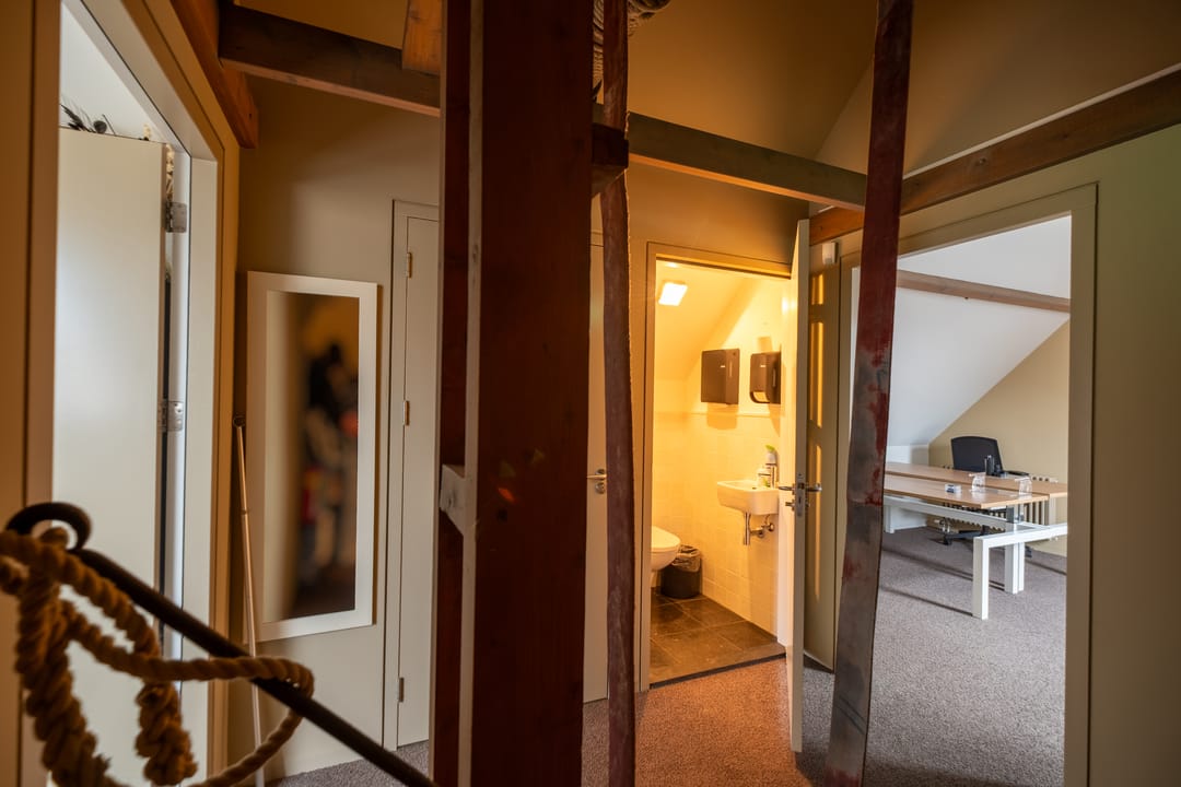 Bij binnenkomst valt direct de prachtige bakstenen klinkervloer in de entree op, evenals de originele maalstoel die herinnert aan de rijke historie van het pand. De aanwezige interieurstructuur met robuuste materialen en hoge ruimtes zorgt voor een sfeervolle basis voor een bijzondere bedrijfsruimte.