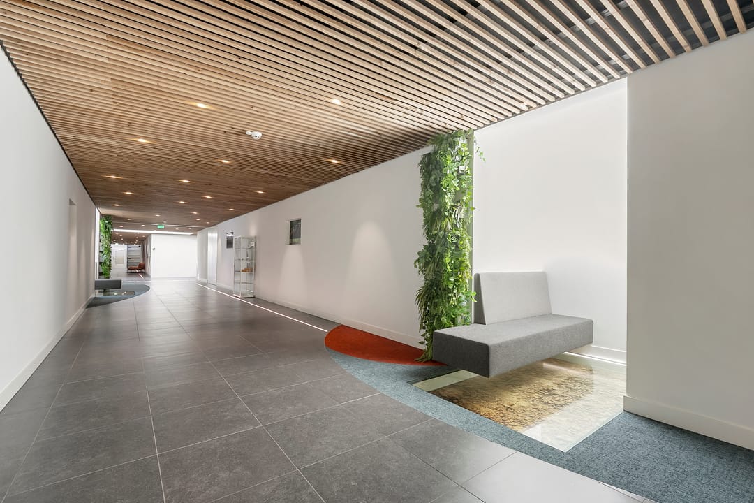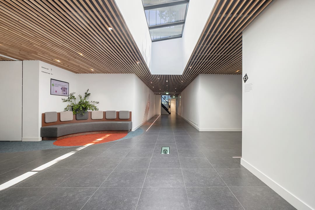 Het gebouw is bovendien WELL Certified (Platinum), wat betekent dat de werkomgeving actief bijdraagt aan de gezondheid en het welzijn van gebruikers, onder andere door monitoring van luchtkwaliteit, licht, comfort en andere welzijnsbevorderende elementen.
