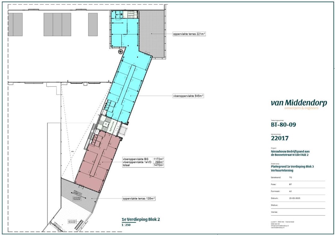 • Kantoorruimte eerste verdieping: circa 545 m² kantoor- en overige ruimtes alsmede circa 221 m² terras;