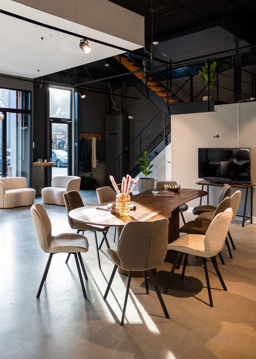 Op de begane grond is een showroom en kantoor voor bedrijfskleding gevestigd. In overleg kan beneden ook gebruik gemaakt worden van een boardroom.