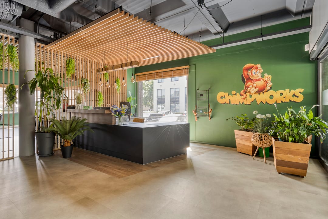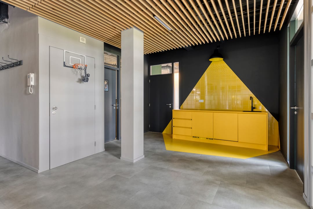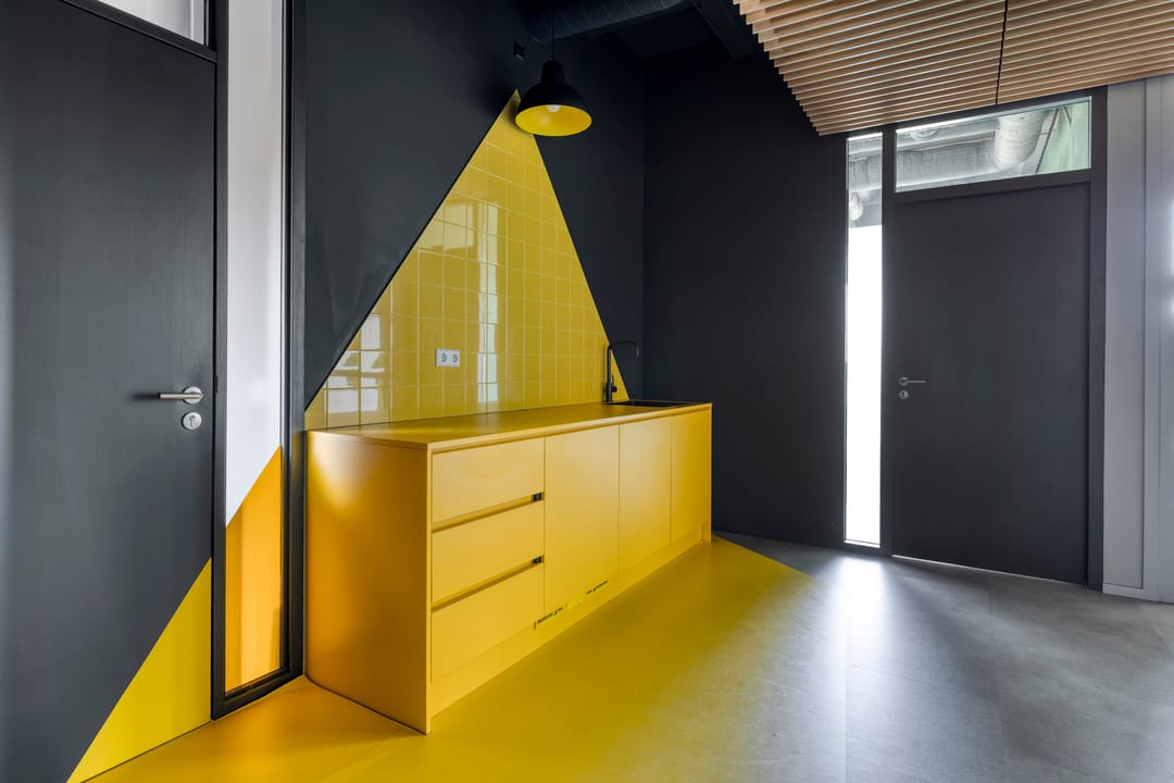 In de kantoortuin, nabij de entree, bevindt zich een moderne, artistiek vormgegeven keuken met koelkast, vaatwasser en spoelbak.