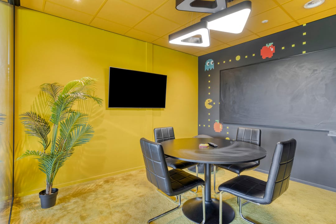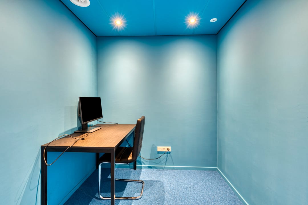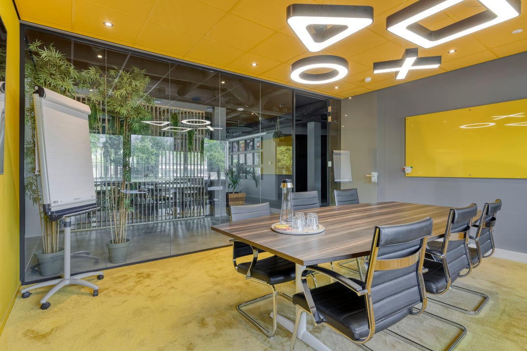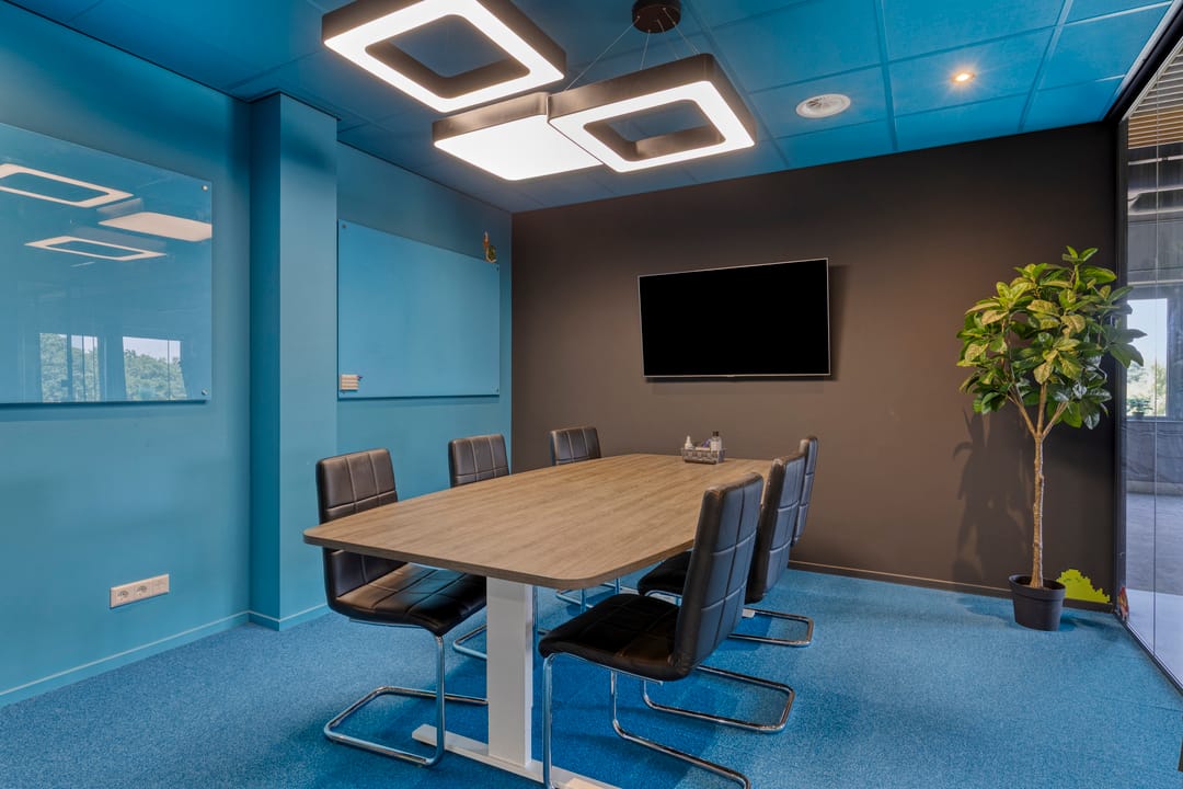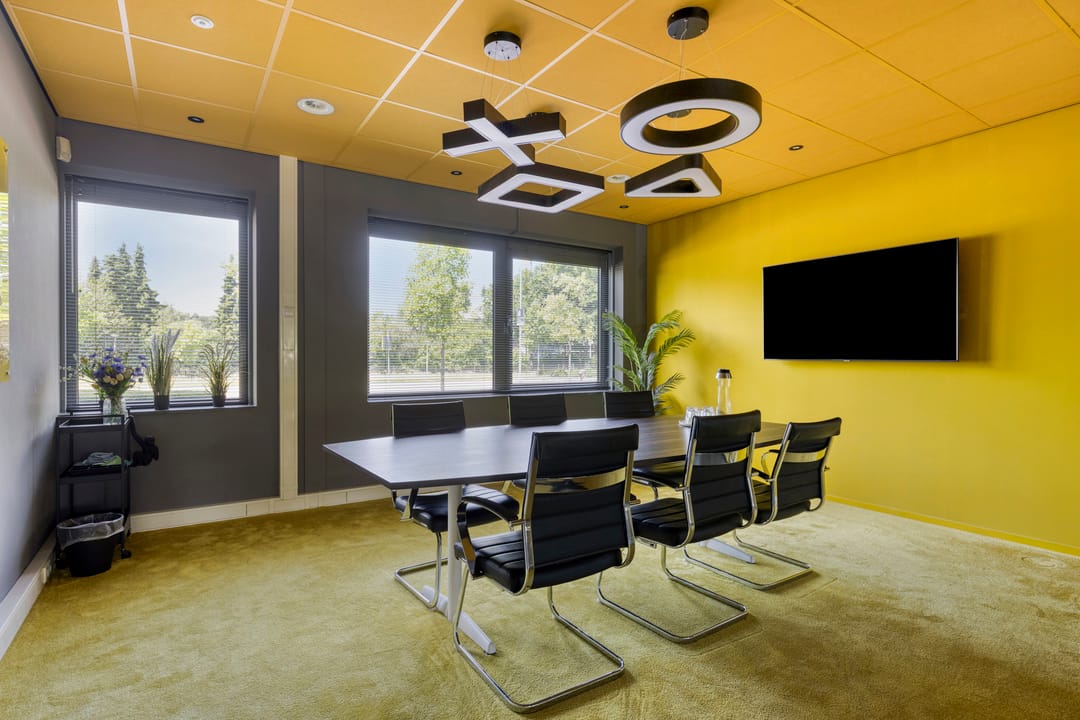 Daarnaast bevinden zich midden in de kantoortuin een tweetal hoogwaardige "glazen" spreekkamers. Door hun positionering zorgen deze spreekkamers voor een tweedeling in de kantoortuin.