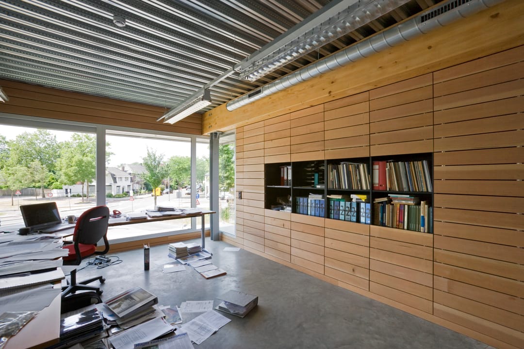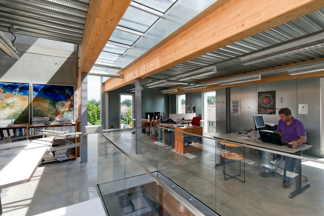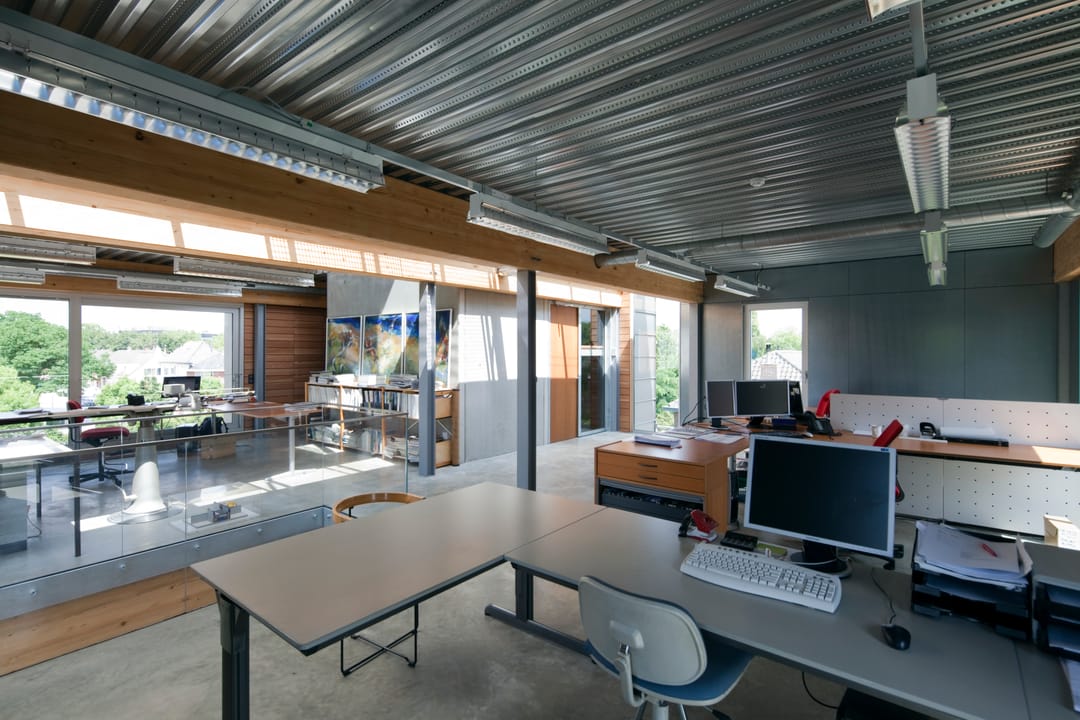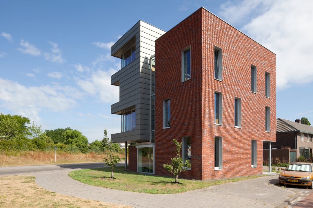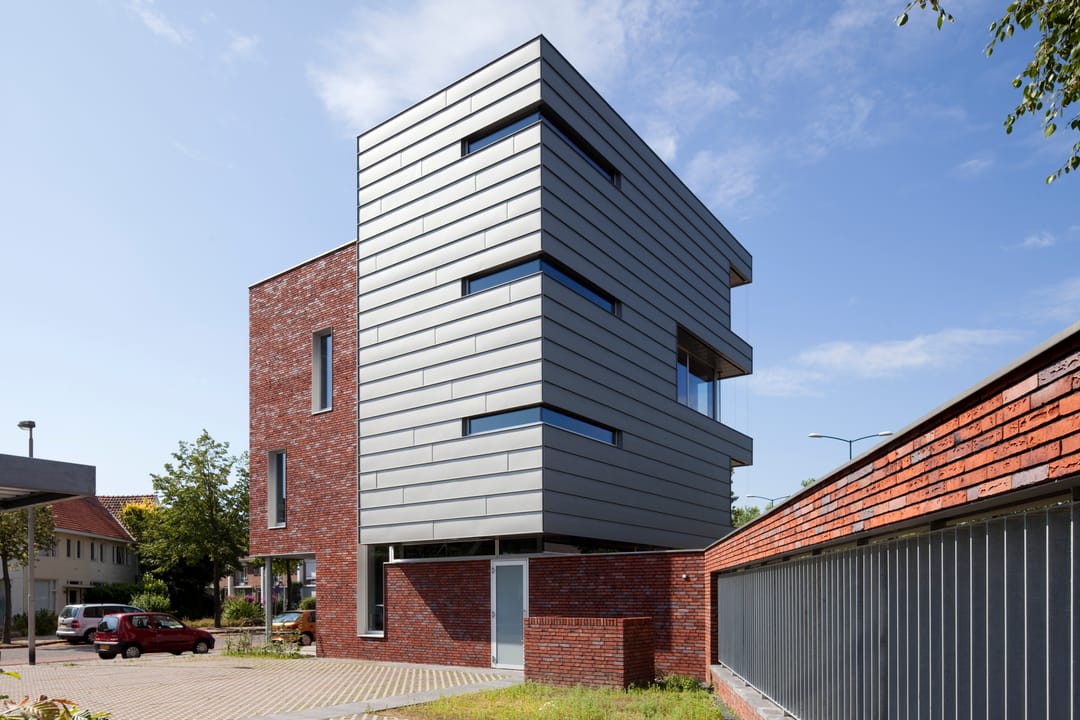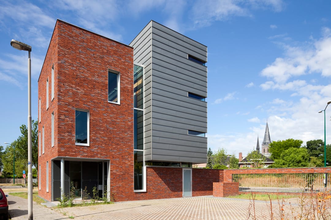 Het betreft een vrijstaand kantoorpand, opgebouwd uit twee bouwvolumes die door een glazen strook met elkaar zijn verbonden en tegelijk visueel van elkaar worden gescheiden. Het bakstenen volume volgt de contouren van het perceel en sluit qua schaal, kleur en materiaalgebruik aan op de omliggende woonbebouwing. De open verbinding tussen de verdiepingen is wat dit object bijzonder maakt.