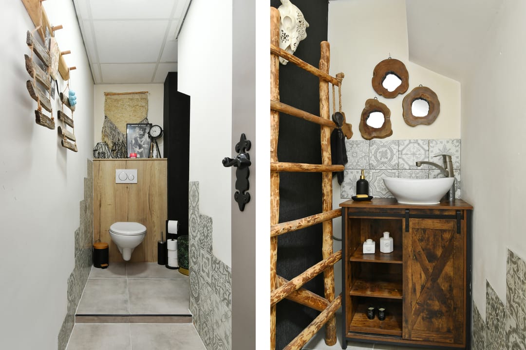 Overloop met een 2de toilet met een inbouwcloset en fonteintje en toegang tot een 2de woonkamer en keuken. De overloop is afgewerkte met een tegelvloer die doorloopt in de woonkamer en keuken.