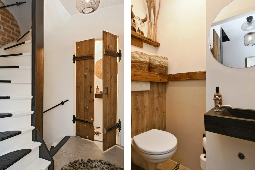 Hal met de meterkast, het toilet met een inbouwcloset en fonteintje en toegang tot de werkkamer en woonkamer.