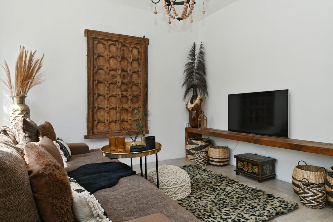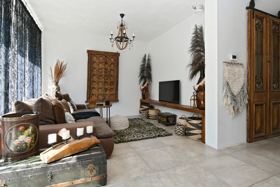 L-vormige woonkamer met een airco en schuifpui naar een balkon, over de breedte van het huis, aan de achterzijde.
