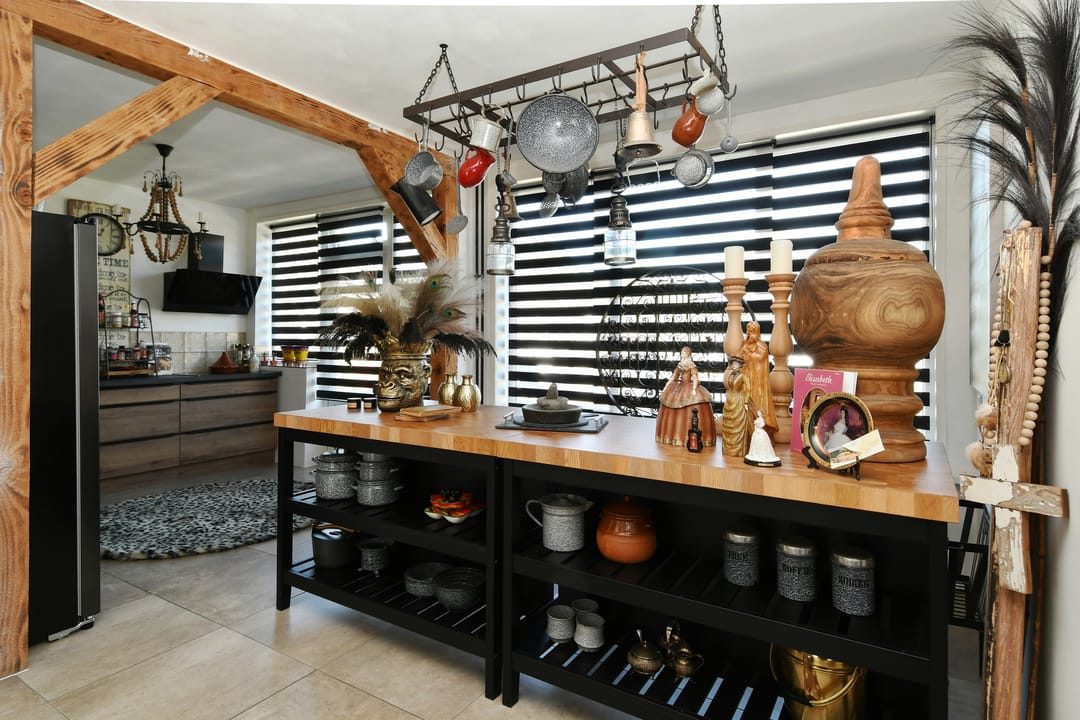 Verder een woonkamer met een open keuken en een serre. De open keuken is uitgerust met een keukenmeubel in wandopstelling en een aparte koelkast. Vanuit de serre middels een schuifpui toegang tot de tuin. Ook deze ruimte zou om te bouwen zijn tot een werkruimte met aparte pantry, spreekkamer en kantoorruimte.