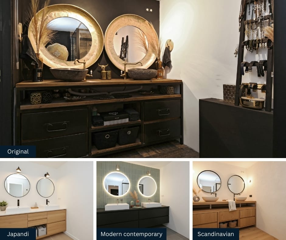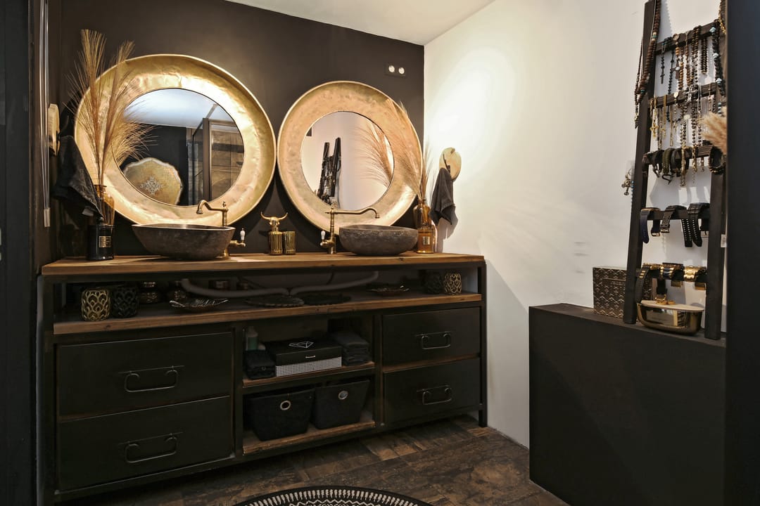 Ibiza stijl badkamer, te openen middels een schuifdeur, met een douchehoek en een dubbele wastafel (natuurstenen waskommen) in meubel.