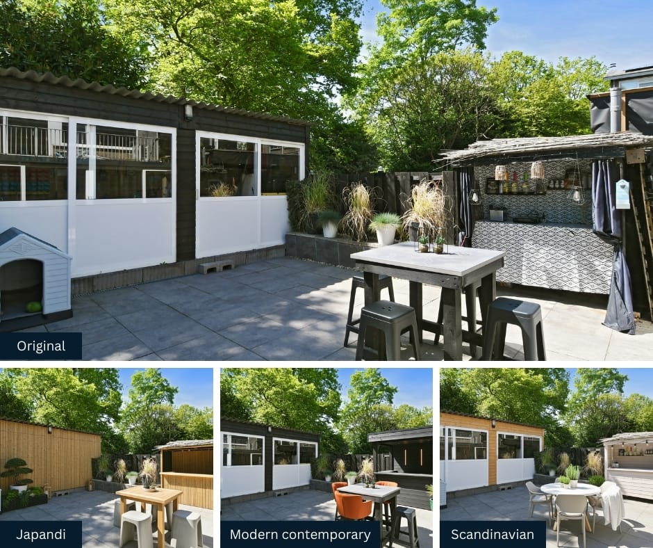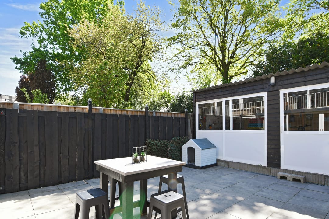 Achtertuin gelegen op het zuiden met bestrating en een berging.
