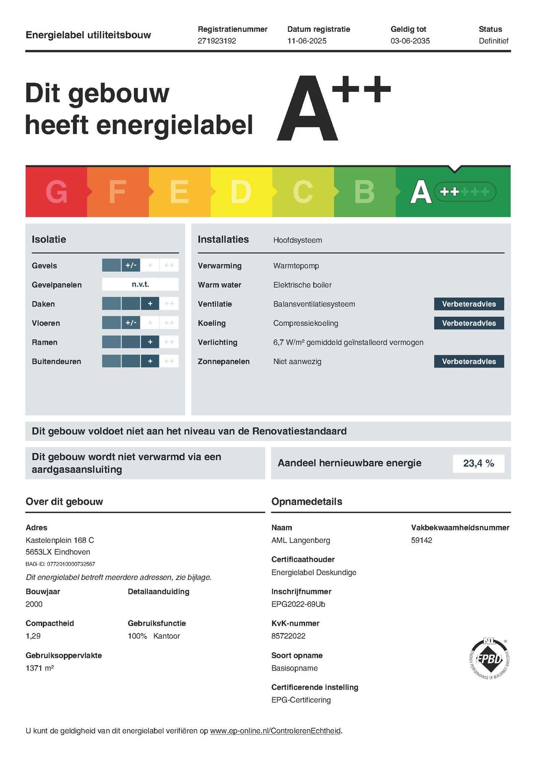 Het kantoorgebouw beschikt over het gunstige energielabel A++ welke geldig is tot 03-06-2035. Hiermee voldoet het kantoorpand reeds aan de overheidsdoelstellingen waarbij vanaf 2023 alle utiliteitsgebouwen minimaal een energielabel C dienen te hebben.
