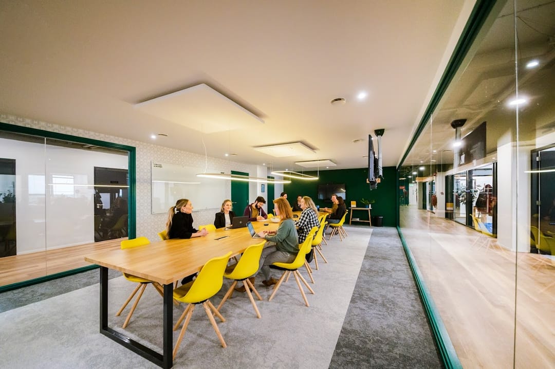 De kantoorruimtes worden volledig gemeubileerd opgeleverd, inclusief werkplekken, verlichting, klimaatregeling en supersnelle internetverbinding.