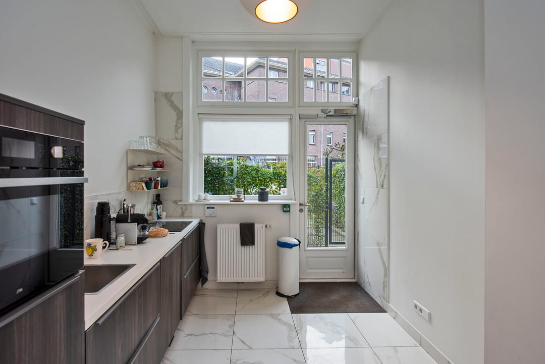 Op de begane grond is de keuken gesitueerd, welke gemeenschappelijk ter beschikking staat aan de huurders binnen deze prachtige kantoorvilla.