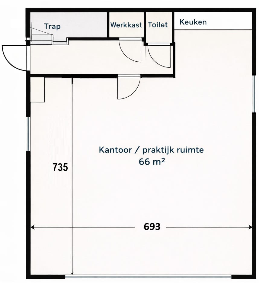 De totale oppervlakte van de ruimte is ca. 70 m² gelegen op de begane grond inclusief eigen sanitair en pantry. Deze combinatie maakt het object uitermate geschikt voor kantoor- of praktijkgebruik, aangevuld met opslag, archief of ondersteunende functies.