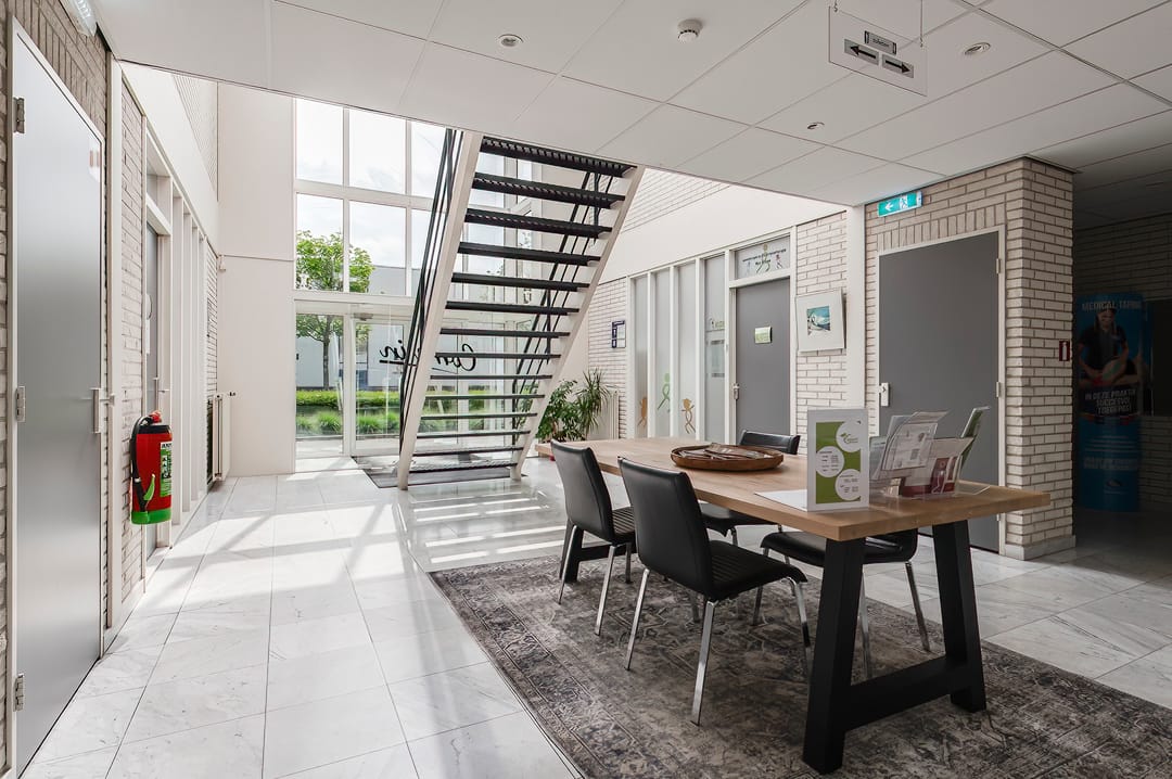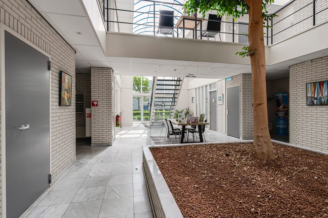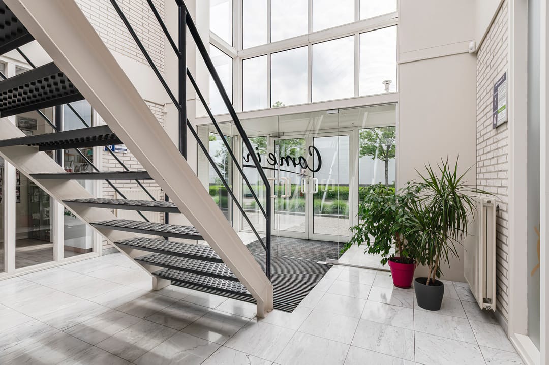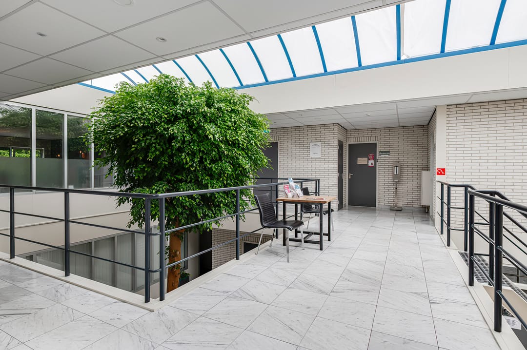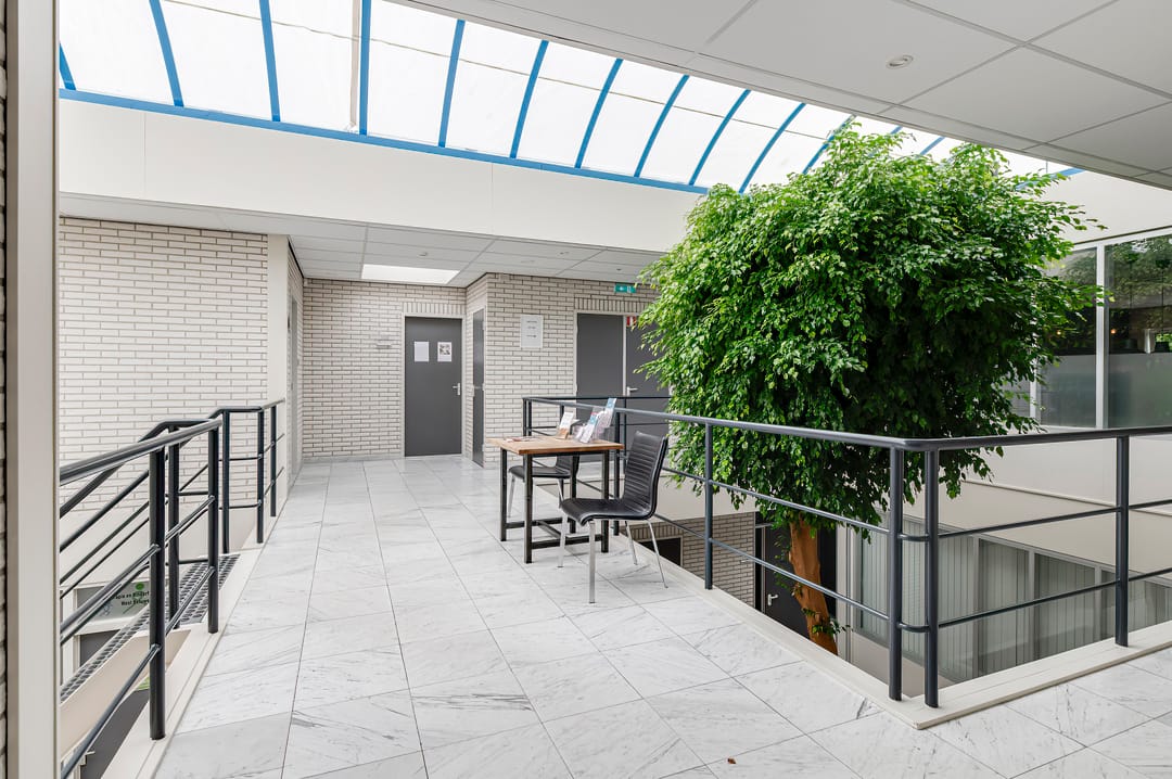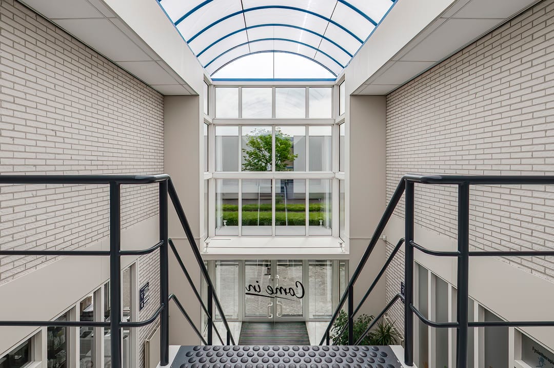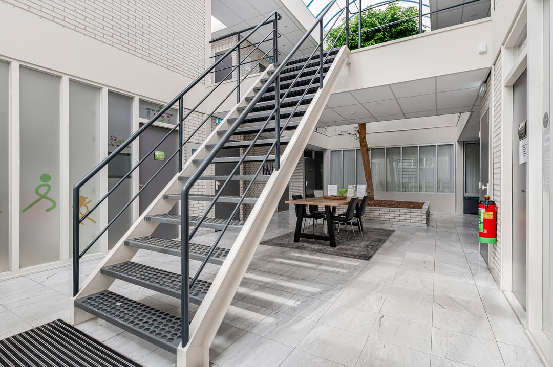 Via de trap en het atrium zijn de kantoren op de verdieping bereikbaar.