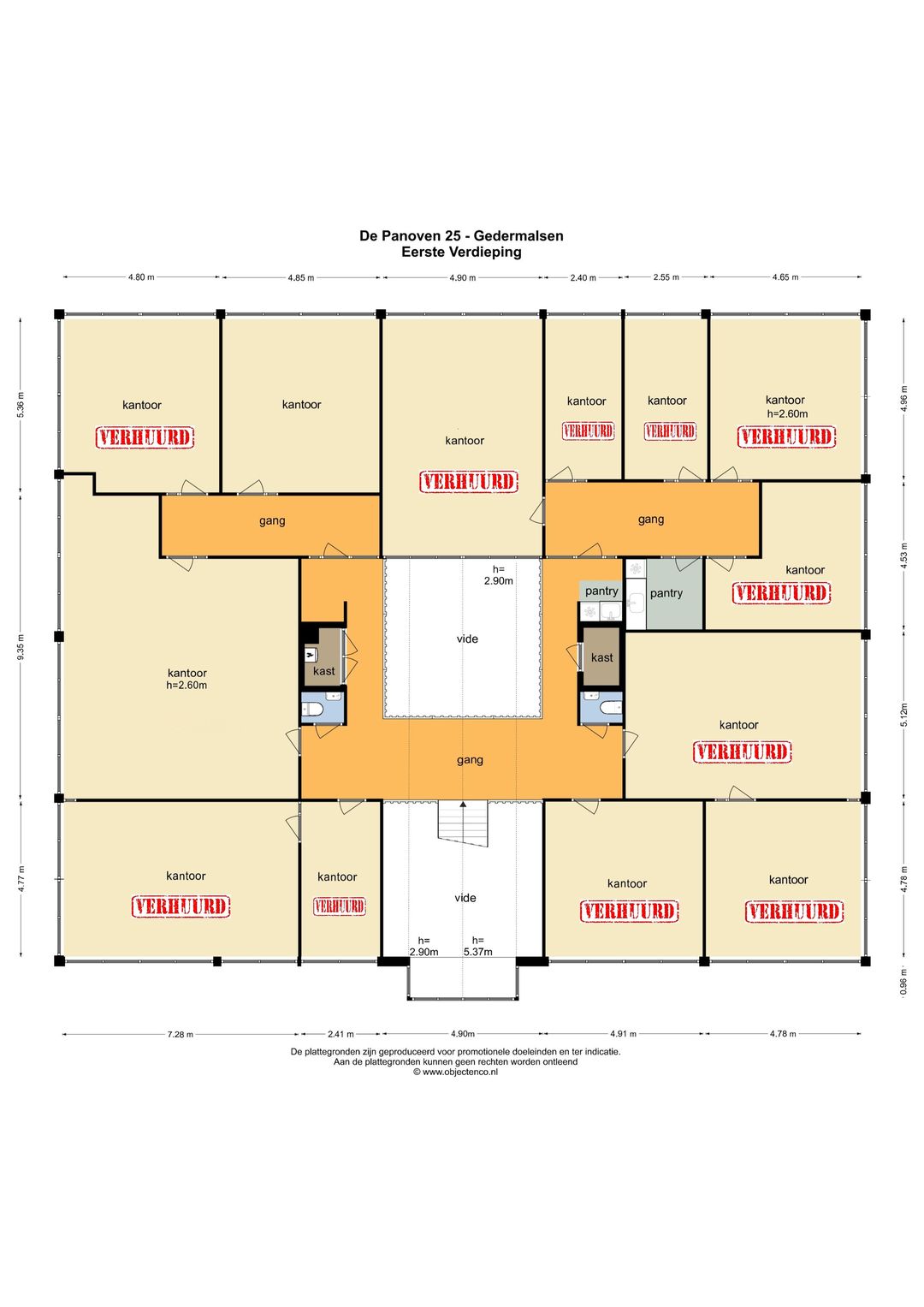 - Kantoor 1e verdieping linkerzijde, grootte 60 m², huurprijs € 930,= per maand.