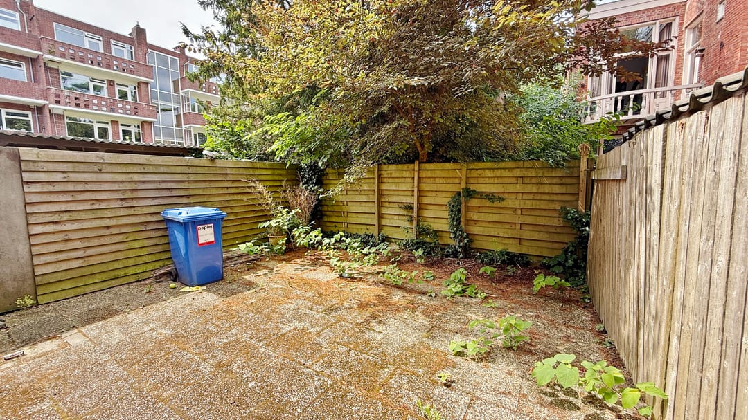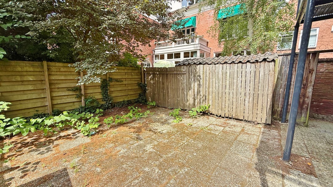 De kantoorruimte heeft een gezamenlijke entree met de bovenwoning (Ubbo Emmiusstraat 13a) en een tuin aan de achterzijde.